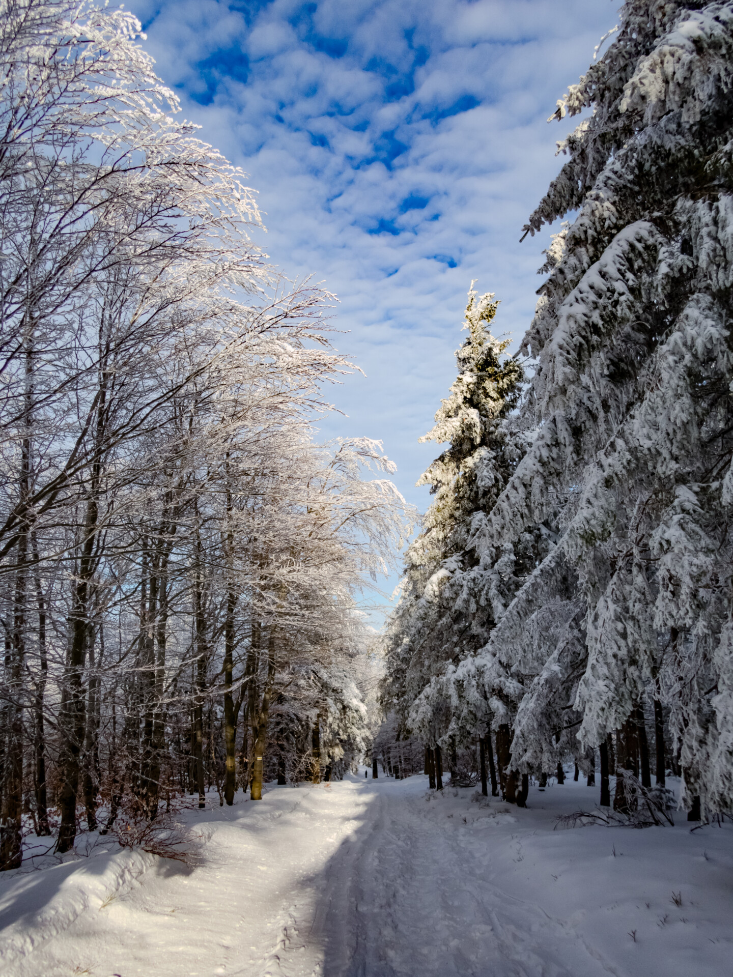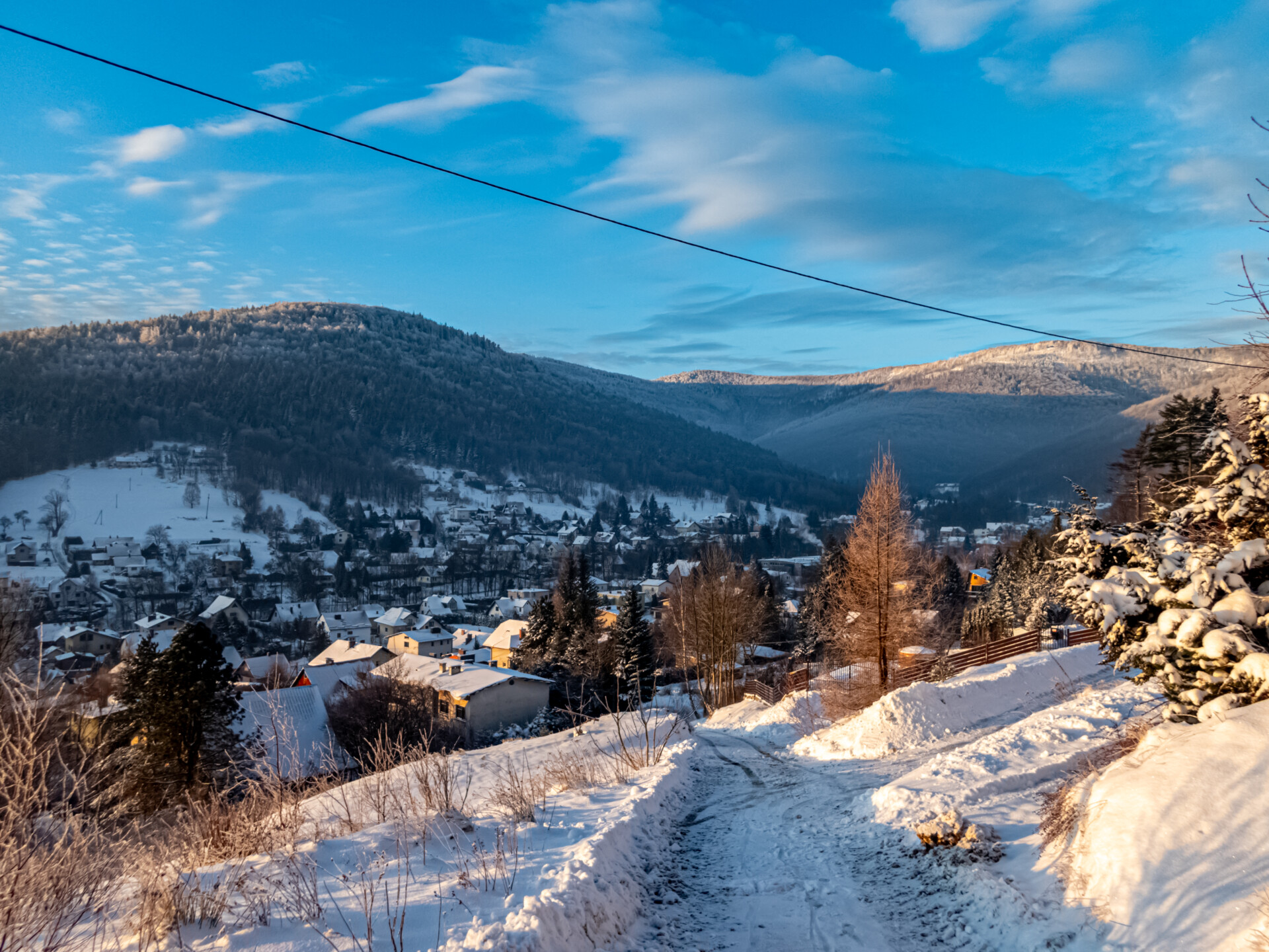 Pierwszy kilometr wiedzie częściowo przez miejscowość Bystra, następnie wchodzi w las i na teren Parku Krajobrazowego Beskidu Śląskiego. Rozgrzewkowe 13% za nami. Dzień się budził. Kolor nieba zniewalał, a pobłyskujące w słońcu drzewa, obsypane szronem i śniegiem, mieniły się niczym ozdobione diamentami.