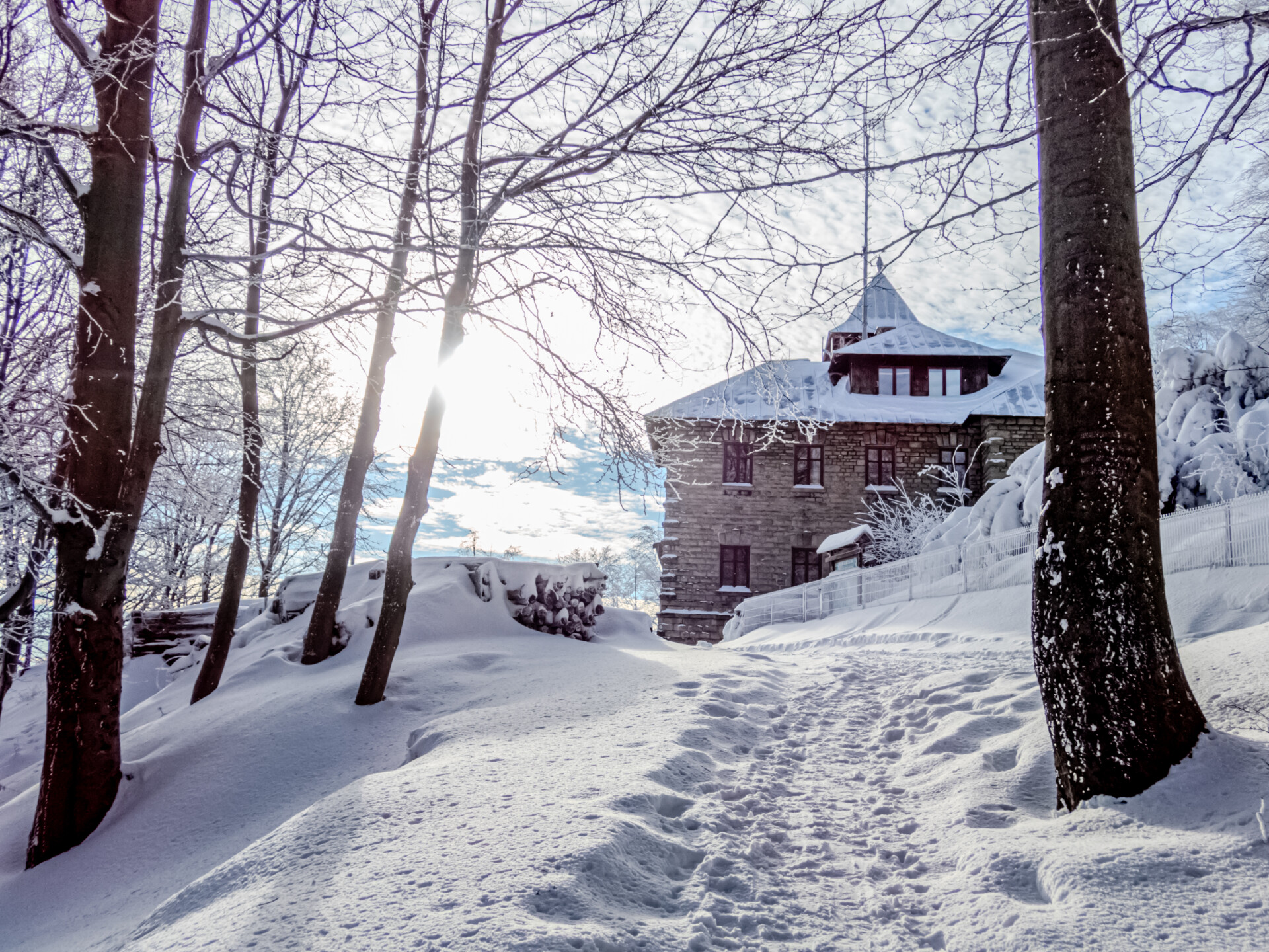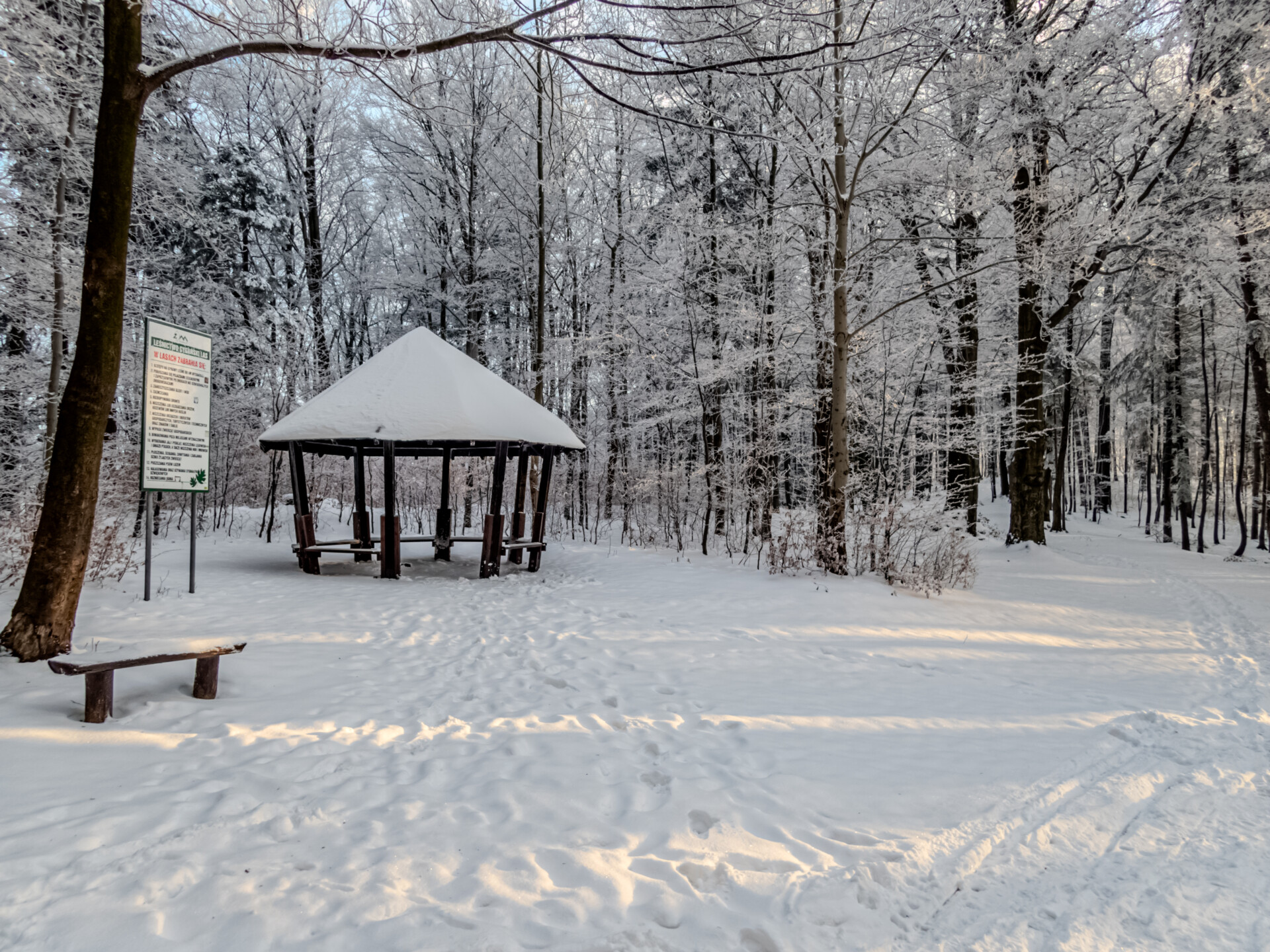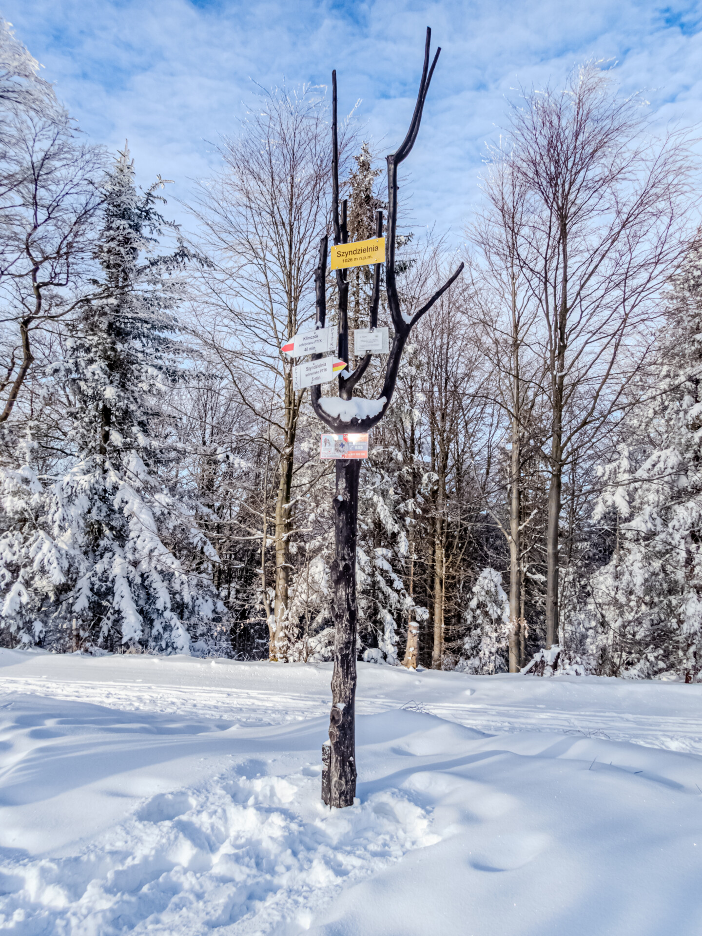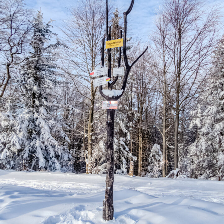 Po dotarciu na Równię pod Kozią kierujemy się niebieskim szlakiem, który przez Stefankę (formalnie „obiekt turystyczny”, nie schronisko) prowadzi na pierwszy dzisiejszy szczyt z listy. Wszystko dopiero budziło się do życia, więc nawet Stefanka wyglądała na zamarłą. Zasypana świeżym śniegiem przypominała chatkę św. Mikołaja. W drewnianej altanie na Koziej Górze (683 m n.p.m.) zameldowałem się 40 minut od startu. Tam spotkałem pierwszych turystów i ruszyłem dalej w dół off-trailem, skracając sobie drogę do Przełęczy Koziej i szlaku żółtego.