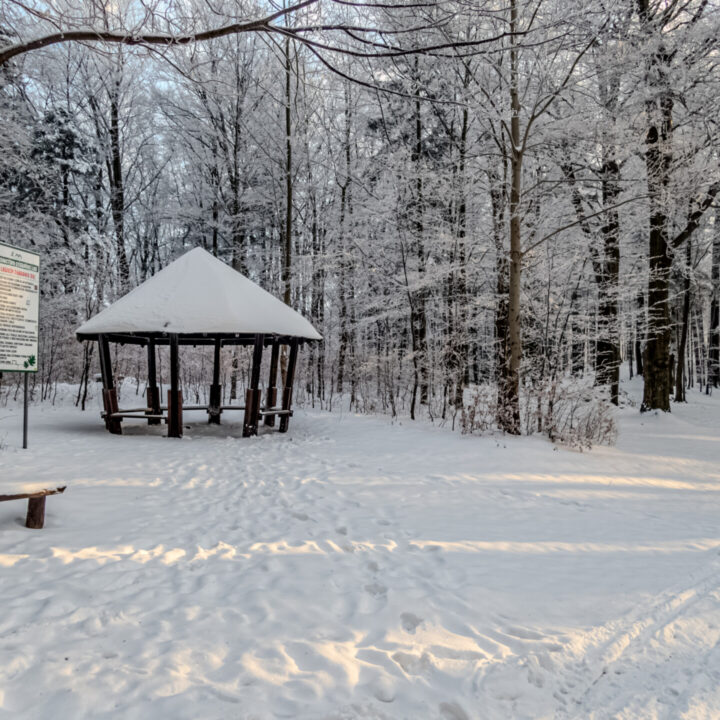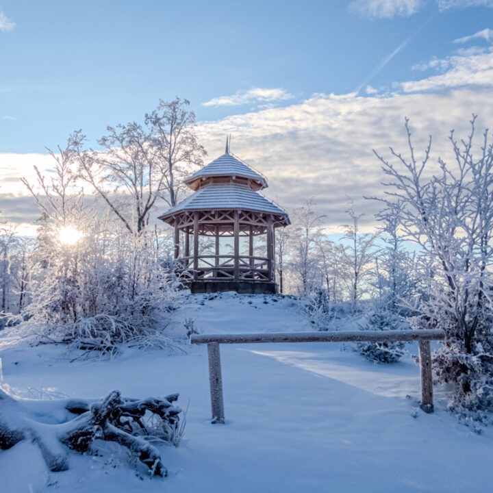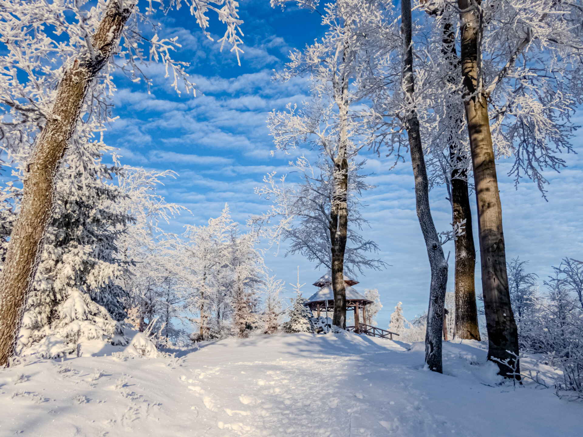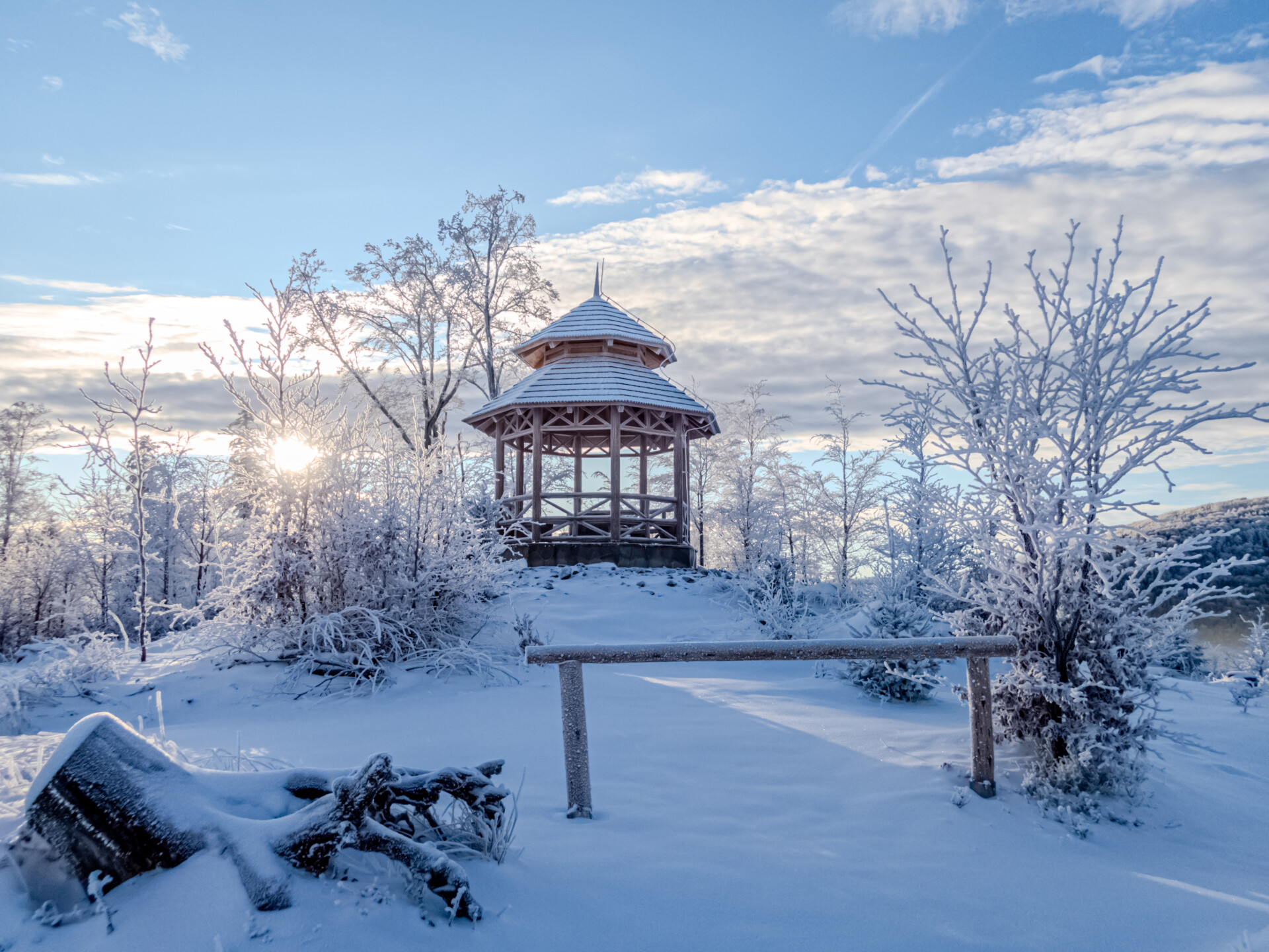 Po dotarciu na Równię pod Kozią kierujemy się niebieskim szlakiem, który przez Stefankę (formalnie „obiekt turystyczny”, nie schronisko) prowadzi na pierwszy dzisiejszy szczyt z listy. Wszystko dopiero budziło się do życia, więc nawet Stefanka wyglądała na zamarłą. Zasypana świeżym śniegiem przypominała chatkę św. Mikołaja. W drewnianej altanie na Koziej Górze (683 m n.p.m.) zameldowałem się 40 minut od startu. Tam spotkałem pierwszych turystów i ruszyłem dalej w dół off-trailem, skracając sobie drogę do Przełęczy Koziej i szlaku żółtego.