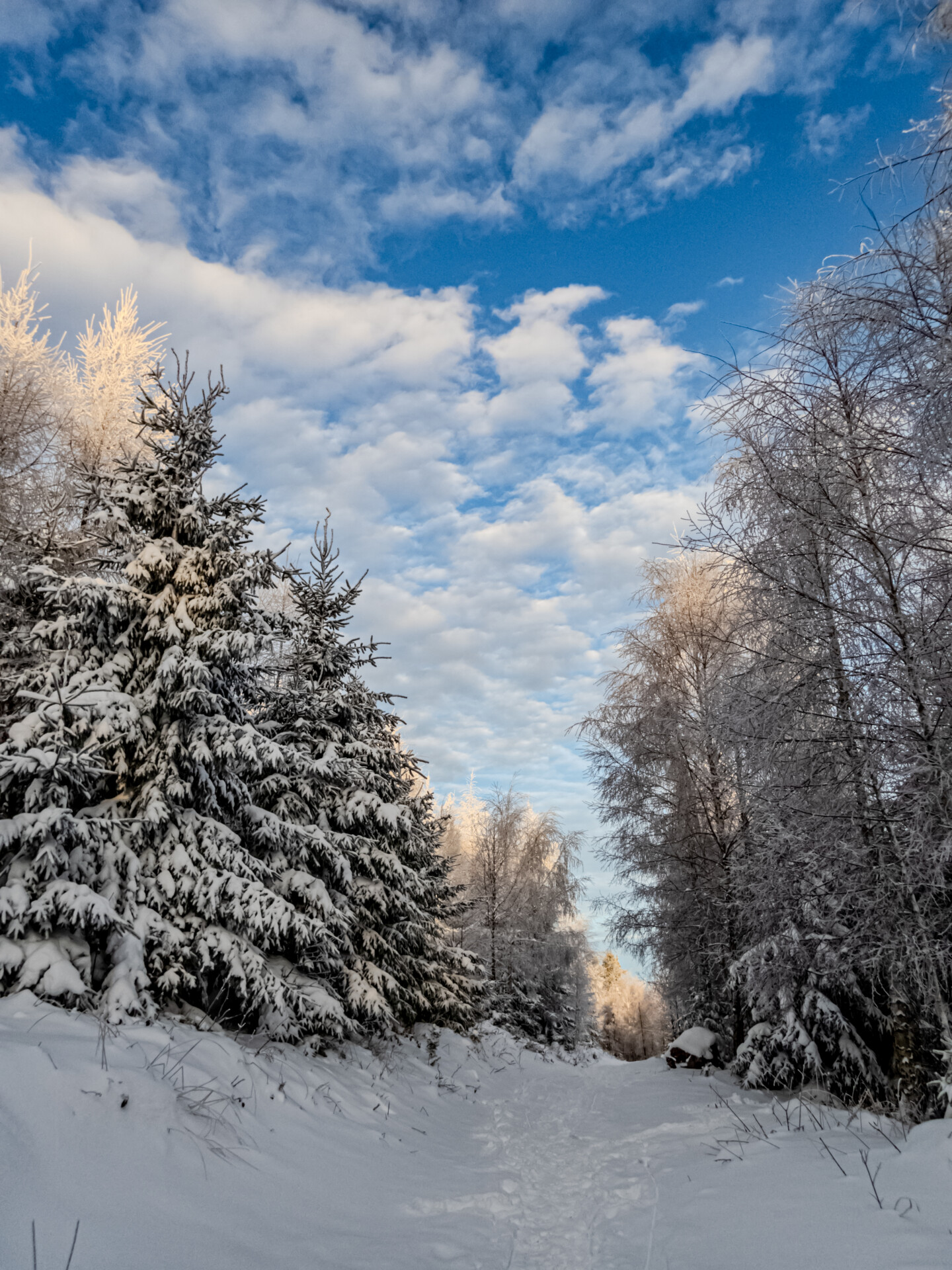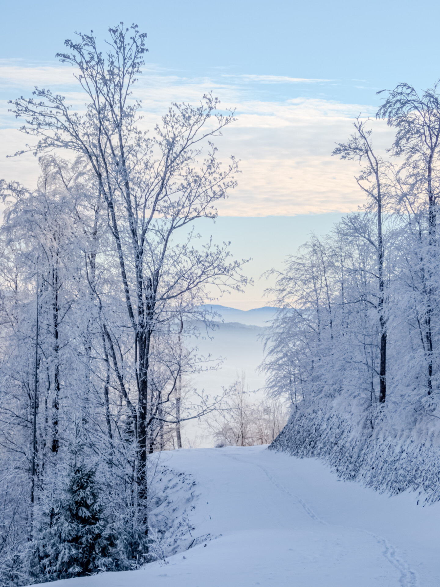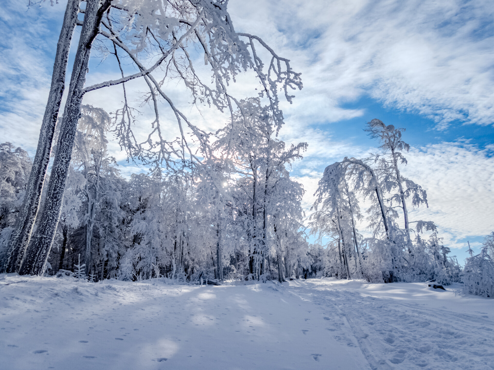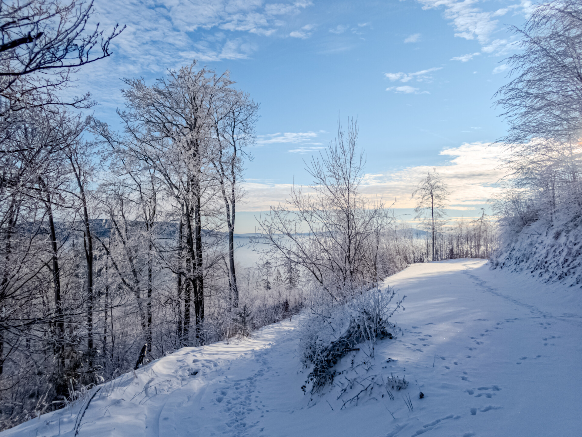 Niestety ten fragment był ledwo przetarty i musiałem dopasować swoje kroki do istniejących śladów. Najpewniej zostawiła je osoba dużo wyższa ode mnie – za nic nie mogłem się z nimi zsynchronizować. Raz po raz kruszyłem zmrożony śnieg, grzęznąc po kolana.