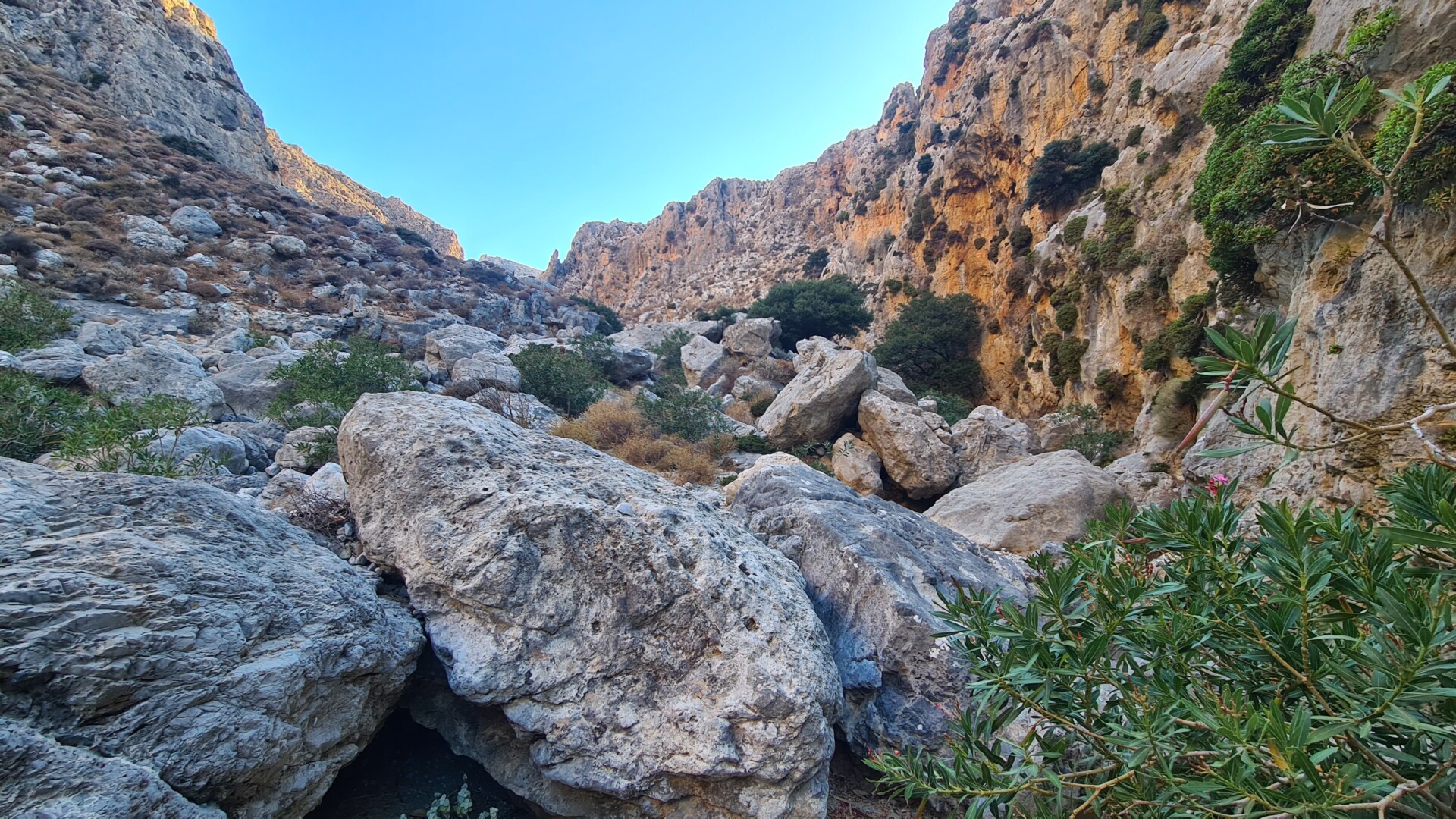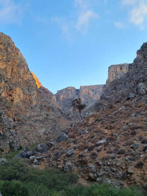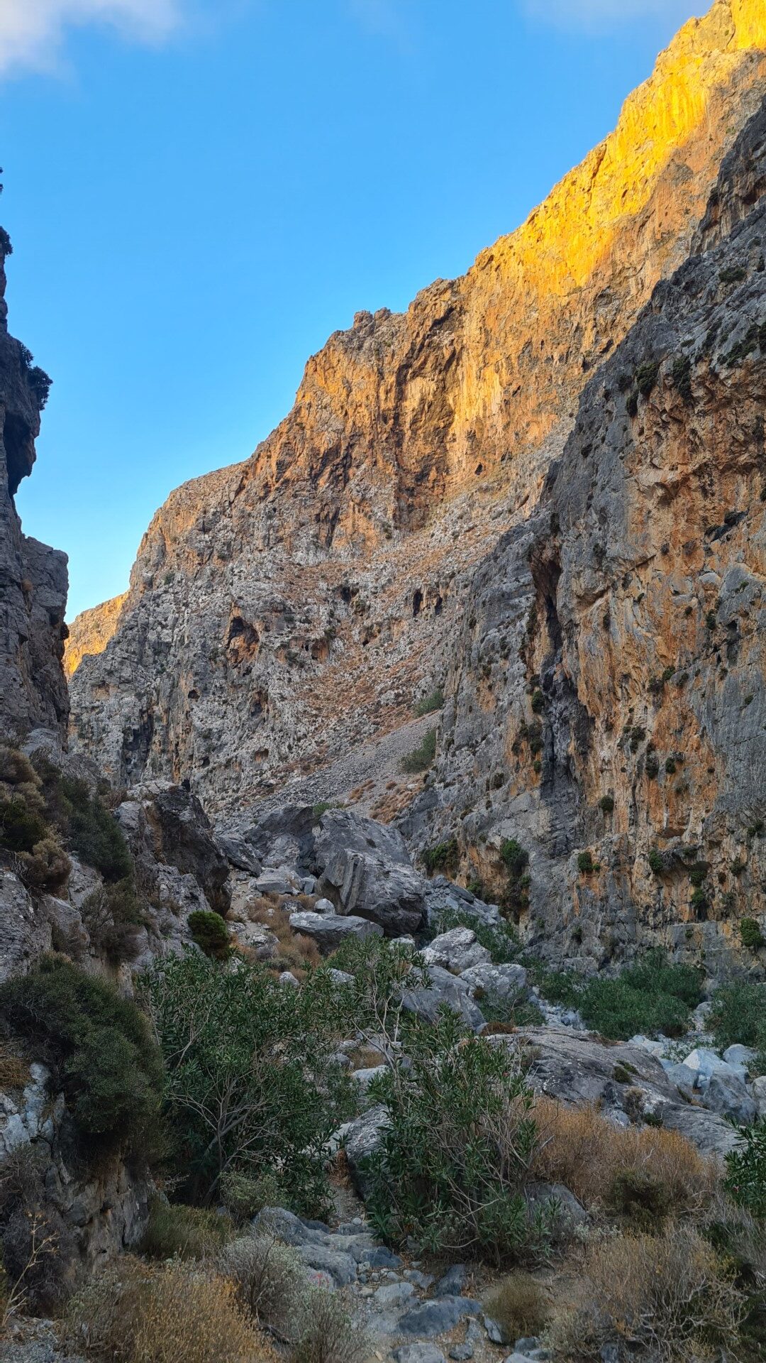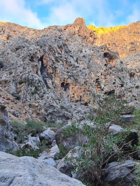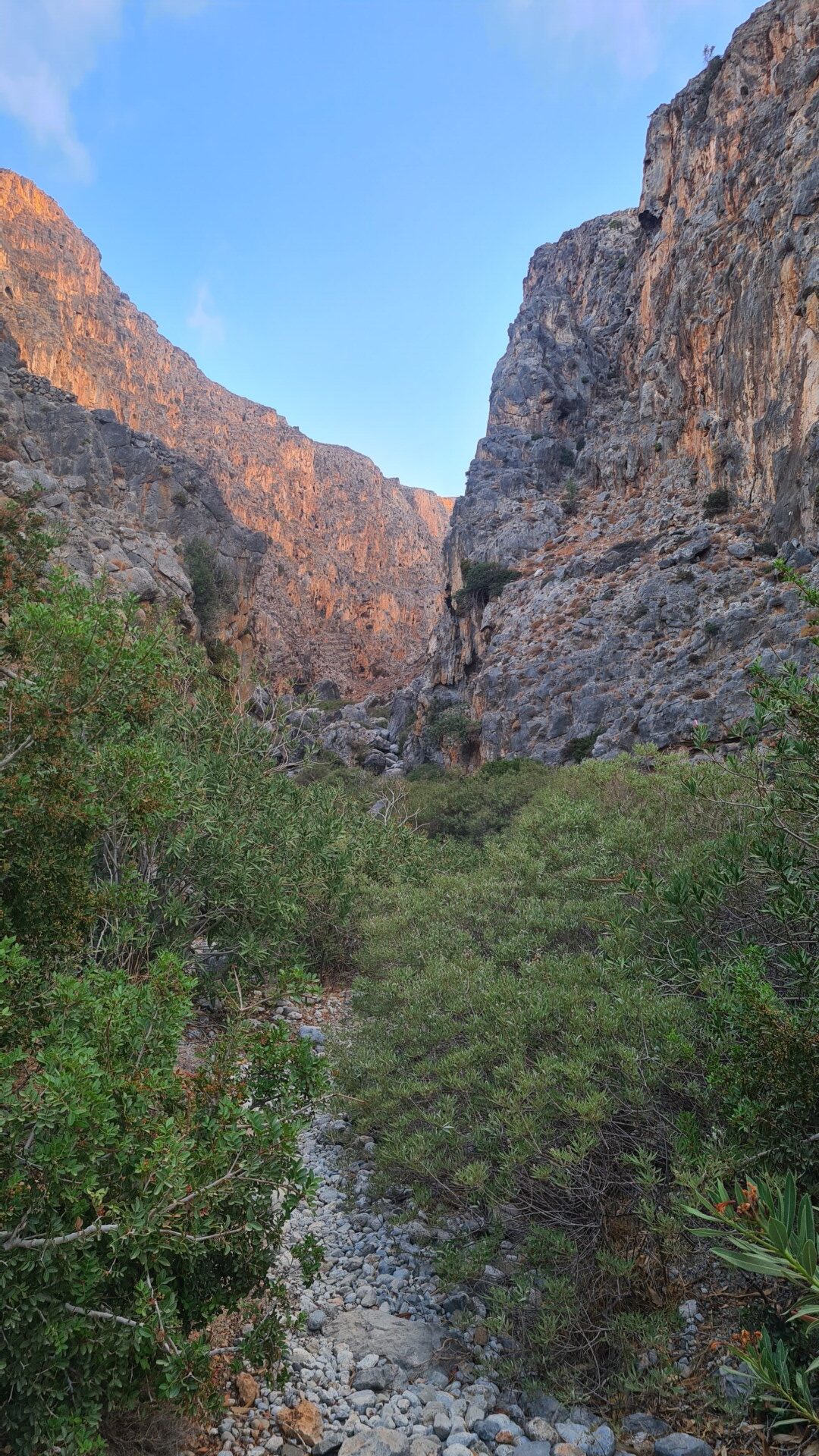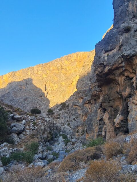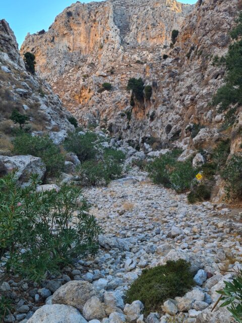 🌄 Widoki – Głębokie ściany wąwozu, surowy krajobraz i spokój gór południowo-wschodniej Krety. W części środkowej doliny robi się naprawdę dziko – cisza totalna. Gdy dociera się na górną część trasy, widok sięga od wzgórz regionu Sitia po Morze Libijskie.