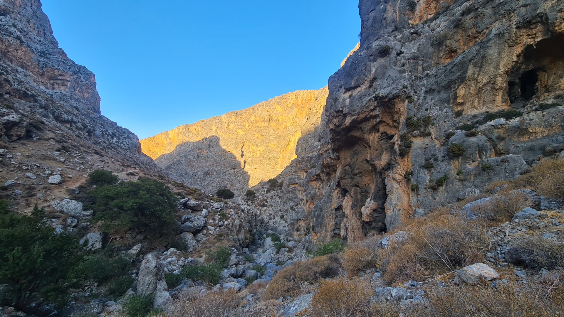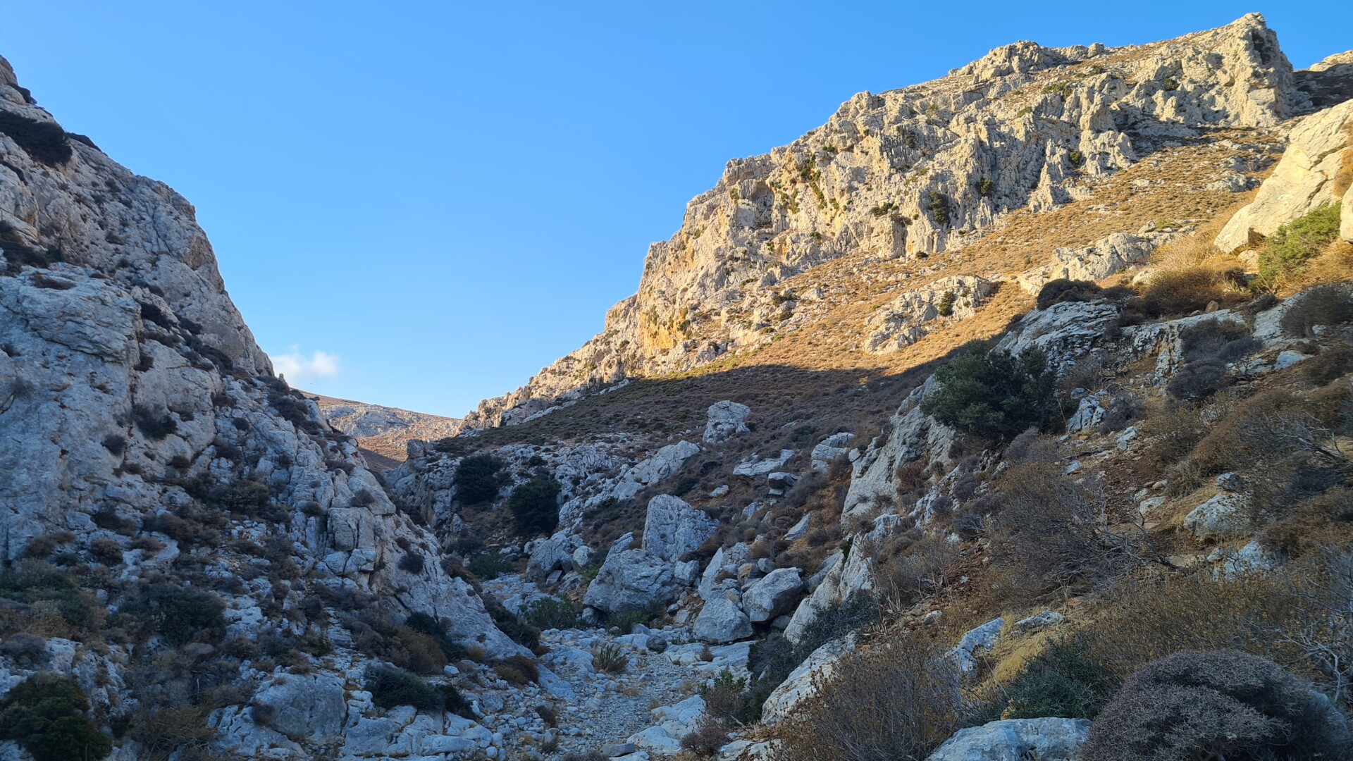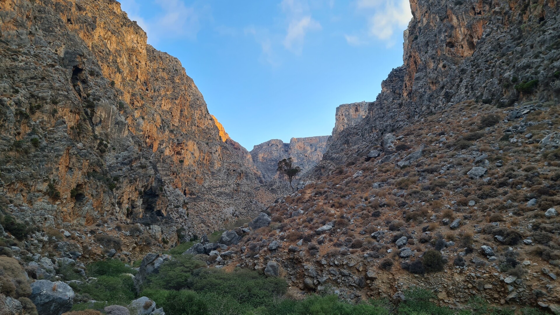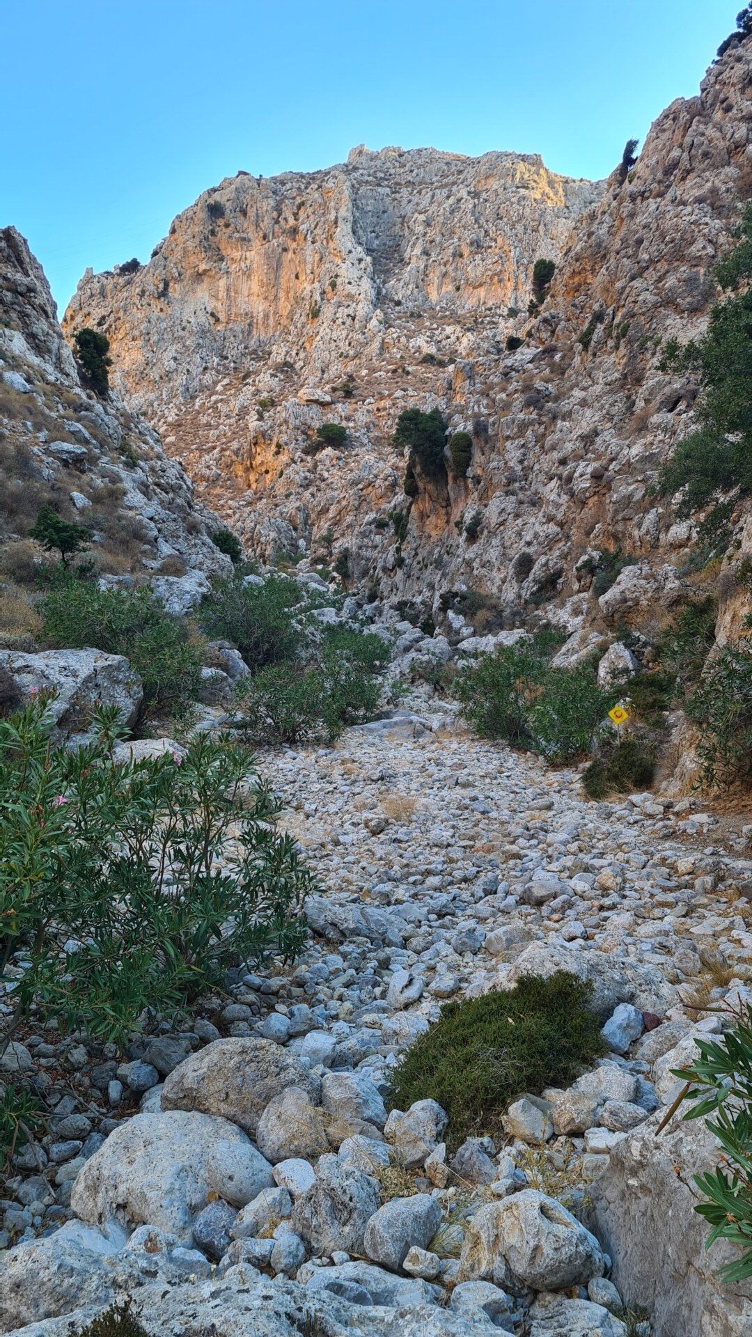 🌄 Widoki – Głębokie ściany wąwozu, surowy krajobraz i spokój gór południowo-wschodniej Krety. W części środkowej doliny robi się naprawdę dziko – cisza totalna. Gdy dociera się na górną część trasy, widok sięga od wzgórz regionu Sitia po Morze Libijskie.