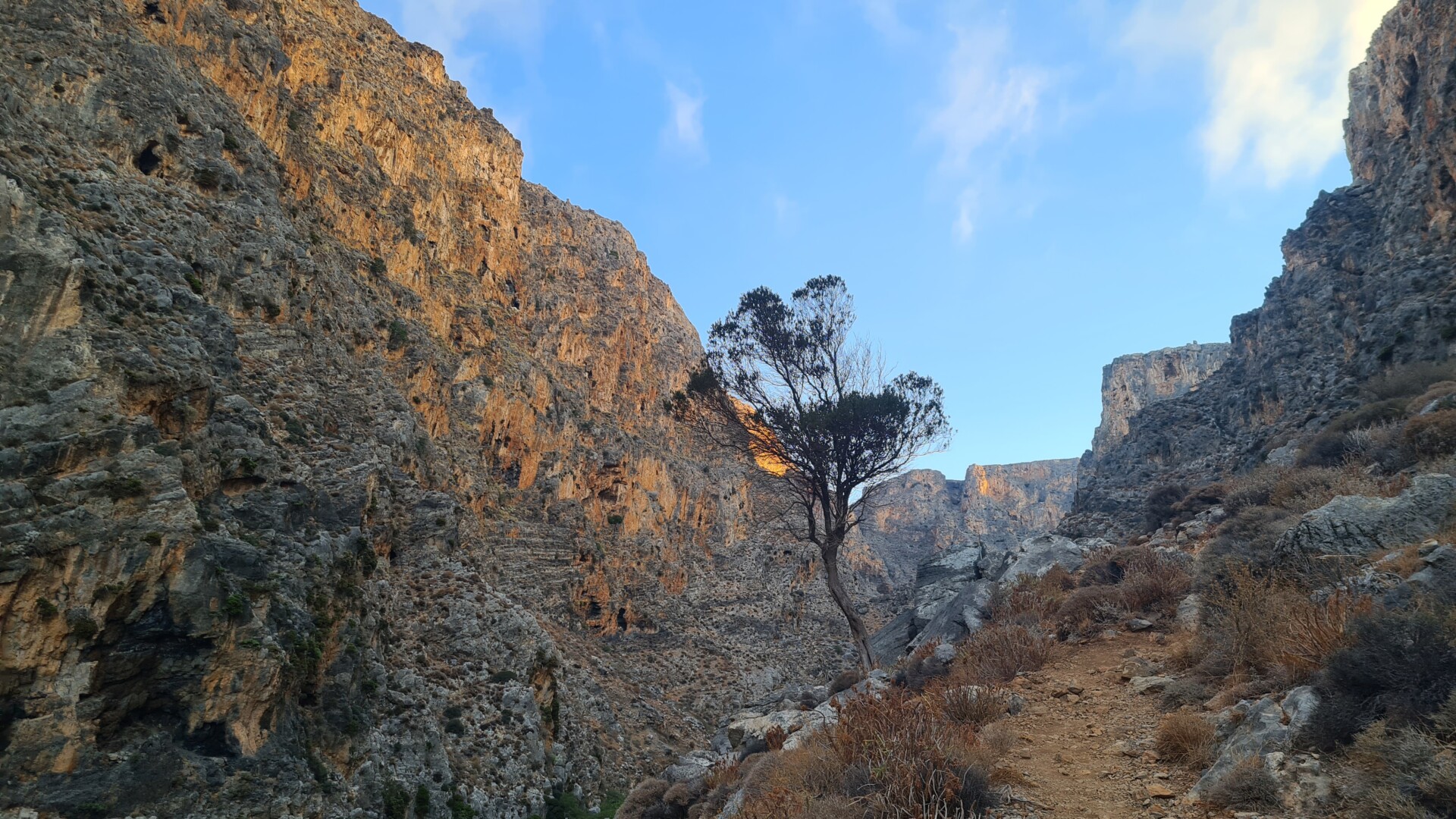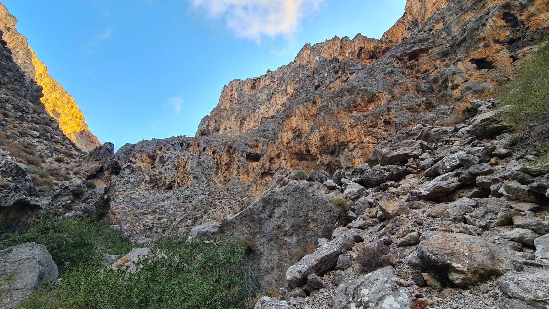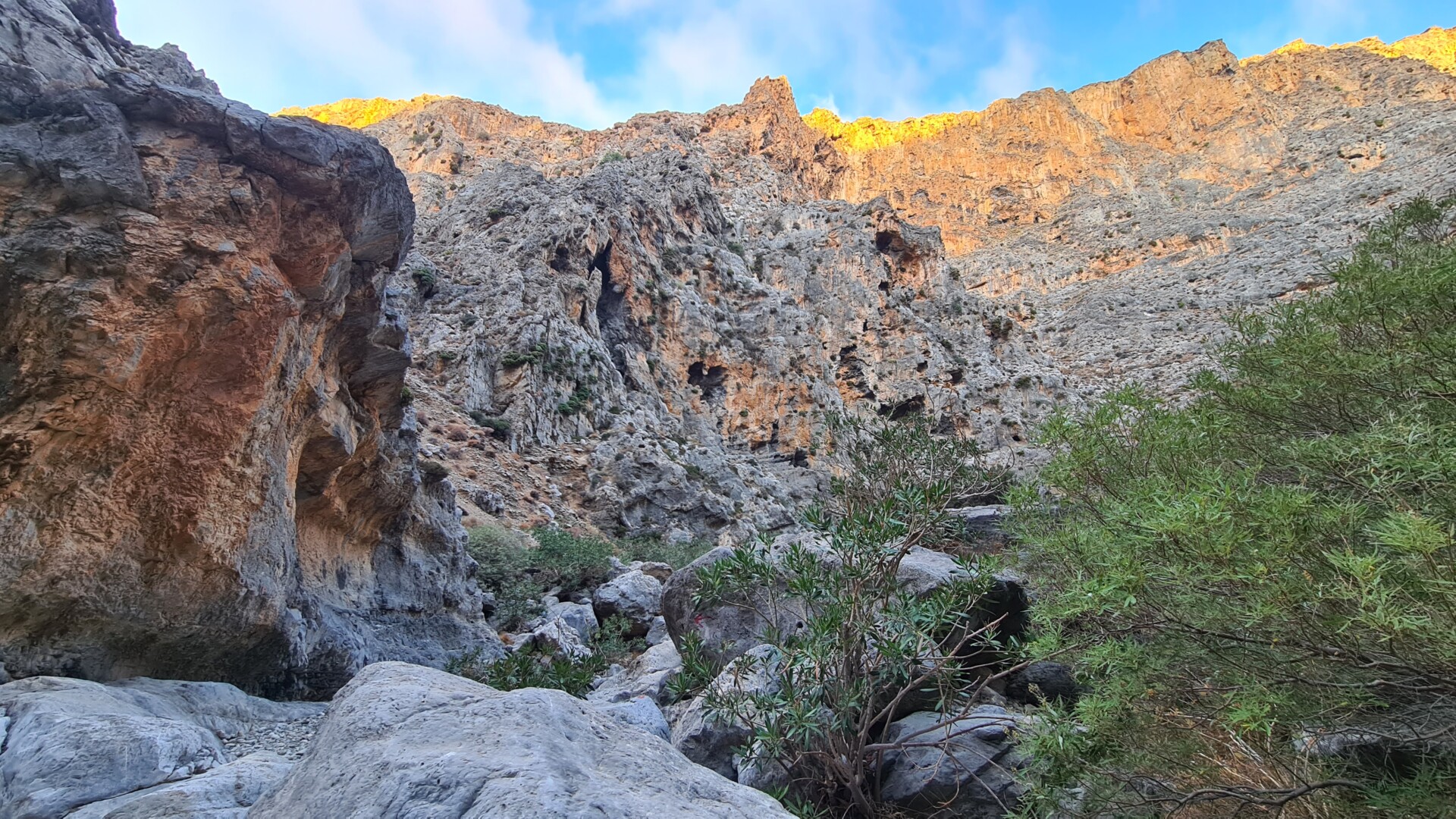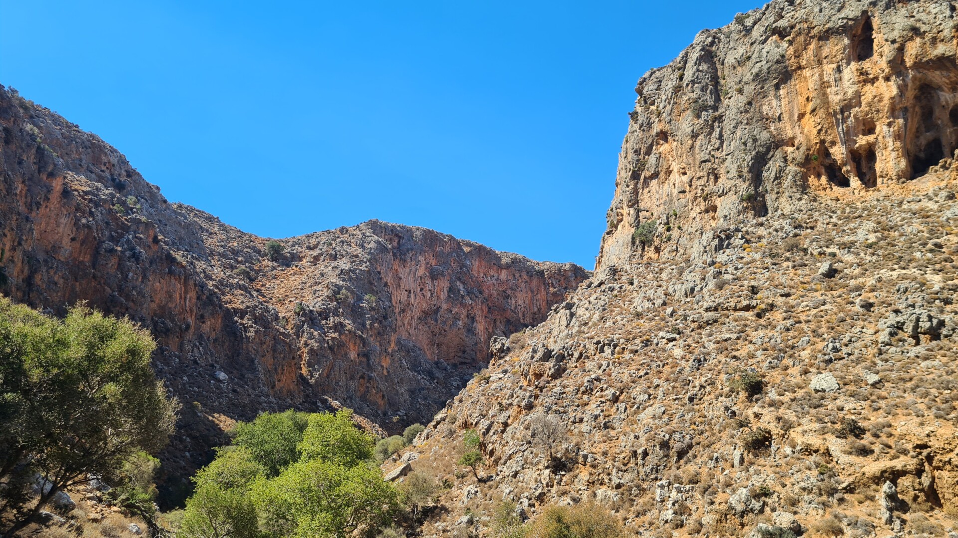 🌄 Widoki – Głębokie ściany wąwozu, surowy krajobraz i spokój gór południowo-wschodniej Krety. W części środkowej doliny robi się naprawdę dziko – cisza totalna. Gdy dociera się na górną część trasy, widok sięga od wzgórz regionu Sitia po Morze Libijskie.