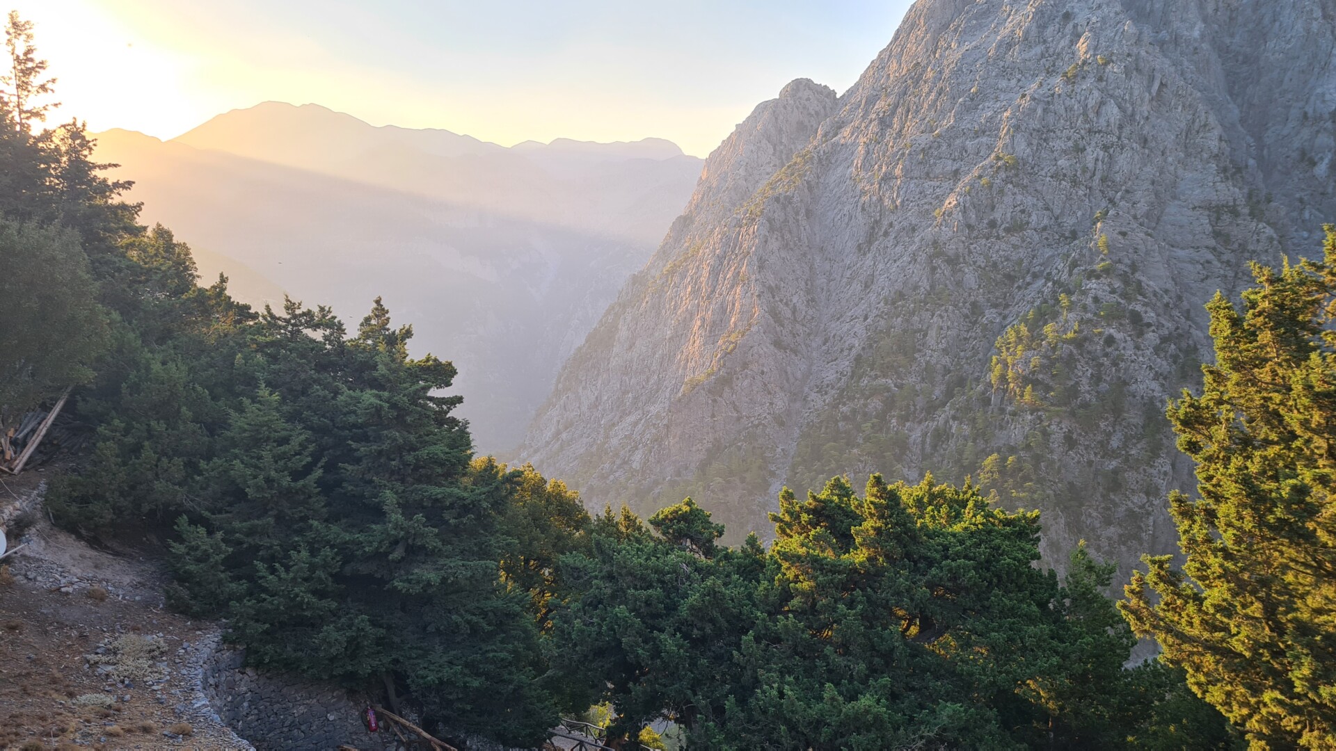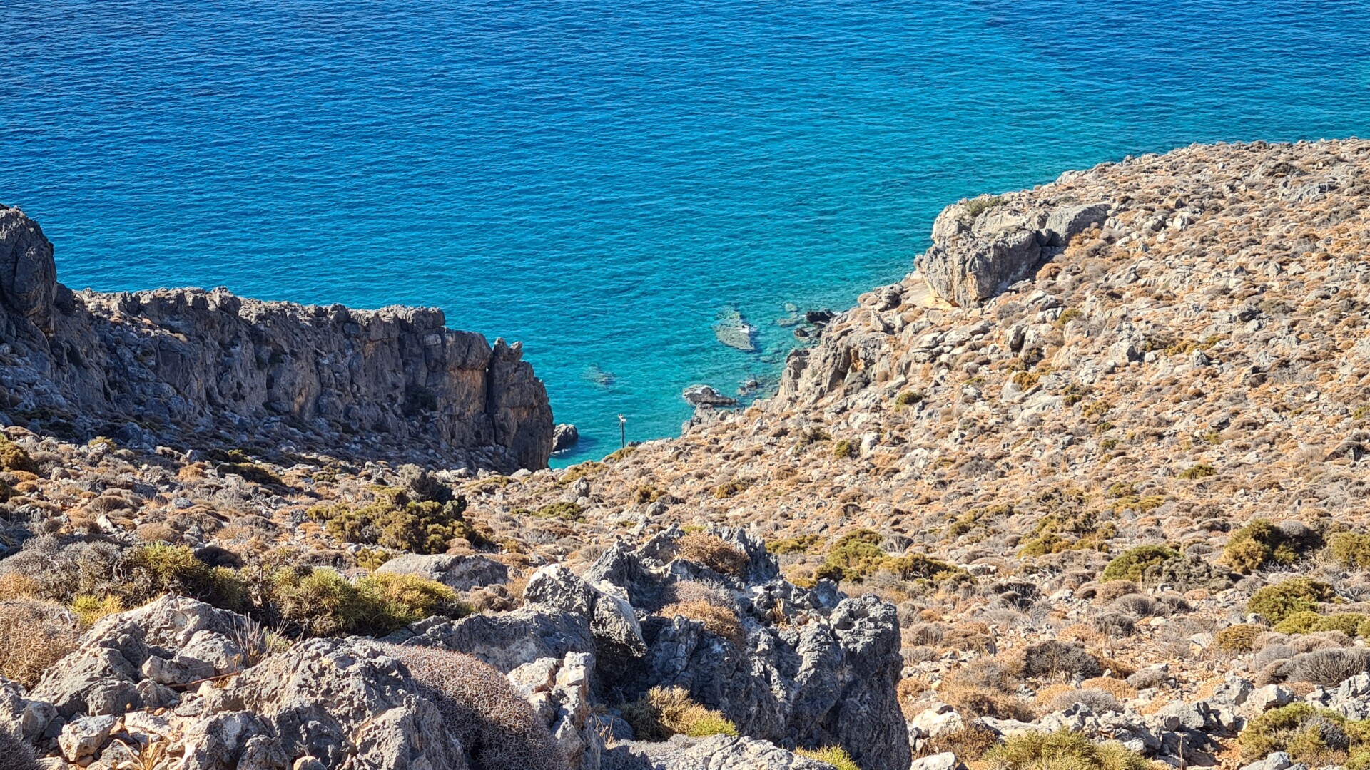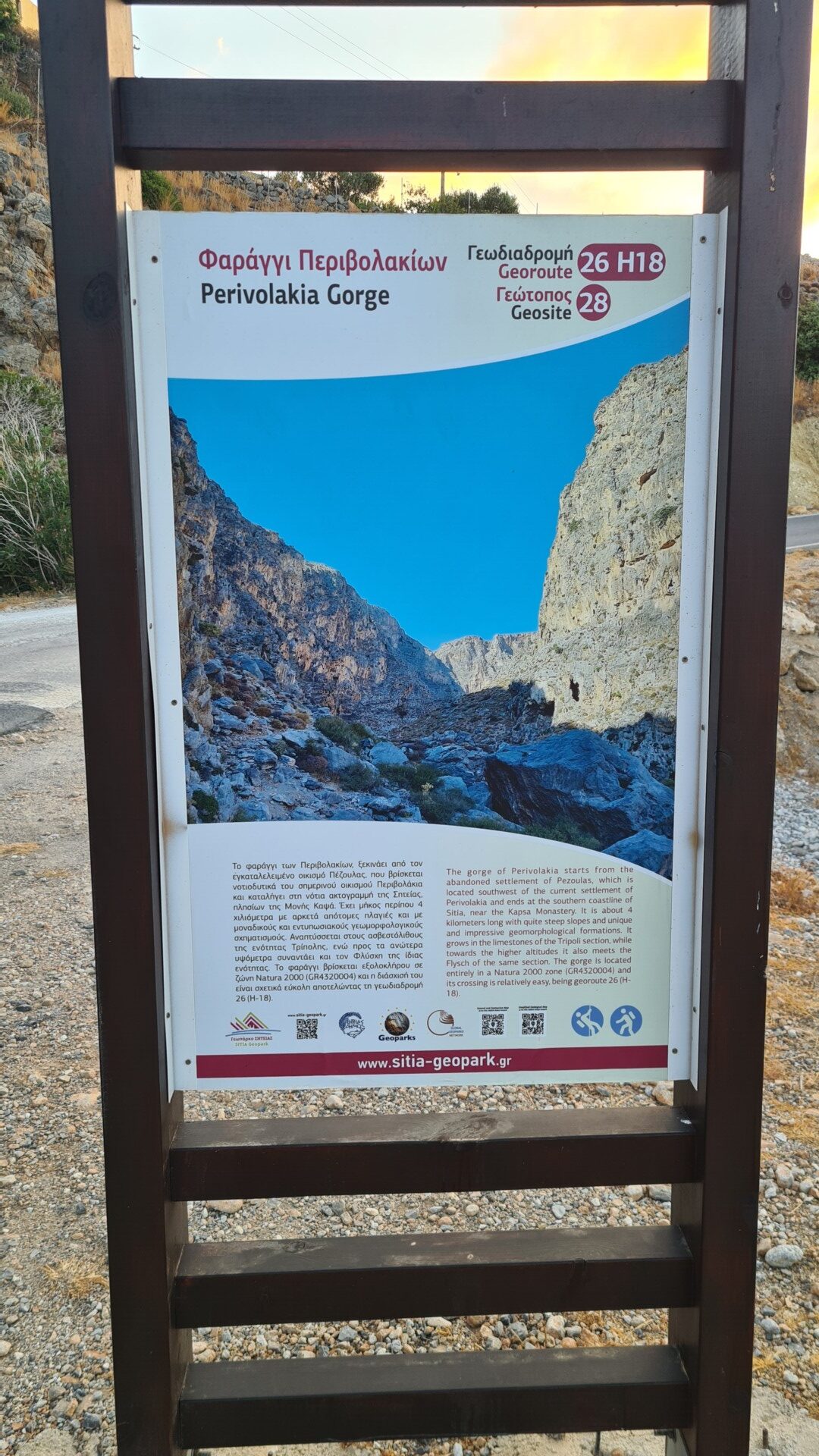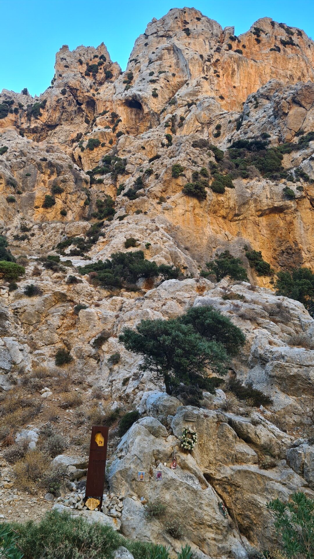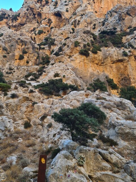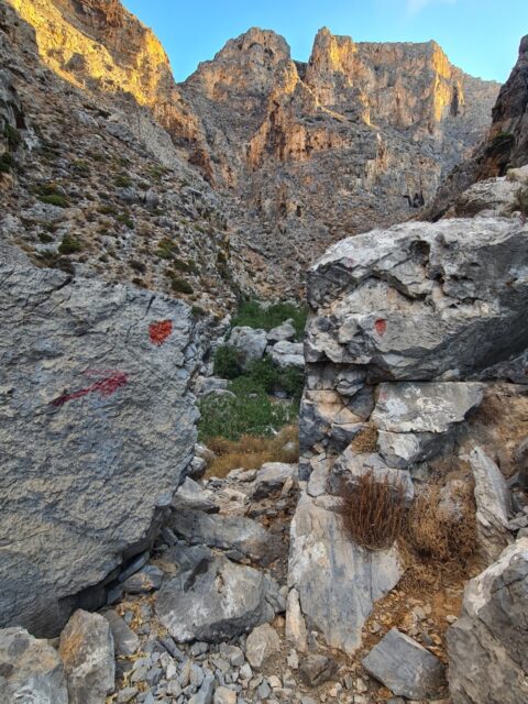 🧭 Orientacja – W dnie wąwozu orientację utrudnia brak oficjalnego szlaku – jedyne oznaczenia to czerwone kropki na kamieniach i ścianach. Trzeba być uważnym, bo nietrudno zejść z właściwej ścieżki. Na płaskowyżu i powrotnej drodze sytuacja niby jest oczywista, ale pozory mogą mylić i łatwo zgubić czerwone kropki. Przy zejściu może to być niebezpieczne, bo w niektórych miejscach, zbocze obrywa się i pionowo opada skałami do poziomu drogi nad morzem. Dlatego istotne jest poruszanie się po wyznaczonej do zejścia ścieżce.