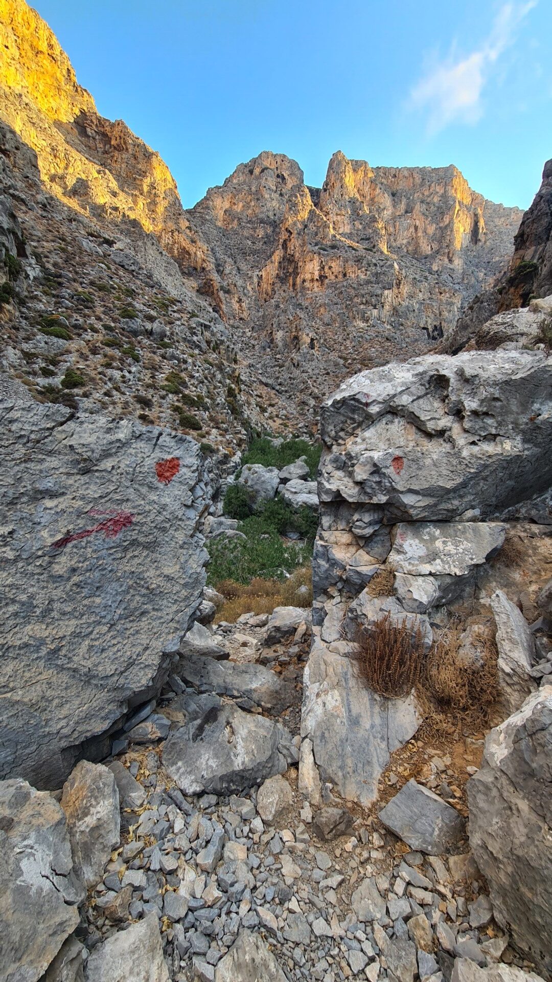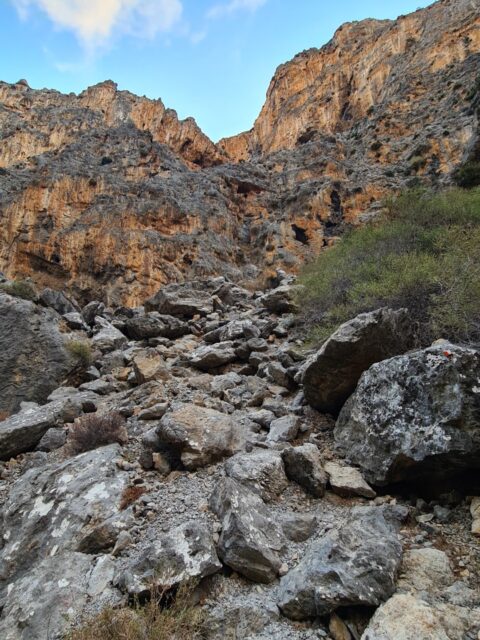 Już od pierwszych metrów wąwozu wpadłem w euforię. Choć błękit morza szybko zniknął z pola widzenia i zostawiłem go za plecami, a zieleń szybko zamieniła się się skalisty krajobraz, to właśnie ta surowość, dzikość, cisza, pustka mnie zafascynowała. Nad wysokimi skalistymi ścianami wisiało błękitne sklepienie, a ja z podekscytowaniem pokonywałem kolejne metry tego całkowicie opustoszałego zakątka wypatrując na skałach charakterystycznych czerwonych kropek wyznaczających trasę. To był w sumie chyba największy challenge – wypatrzeć je było niczym tropienie dzikiej zwierzyny. Pewno zadajecie sobie pytanie, po co wąwozie szukać ścieżki, skoro tak naprawdę po prostu idziemy w górę pomiędzy wysokimi i widocznymi ścianami wyznaczającymi kierunek. W tym wypadku dlatego, że szlak dość malowniczo się wije, ale nie koniecznie dnem wąwozu. Czasem trzeba się ostro wspiąć, innym razem ominąć gruzowisko ogromnych skał, czasem przejść bokiem itd. Szukanie kropek sprawiło, że szedłem dużo wolniej niż zwykle, ale jednocześnie sprawiało wiele satysfakcji, przywołując na myśl tropicieli z Dzikiego Zachodu z książek z lat młodości.