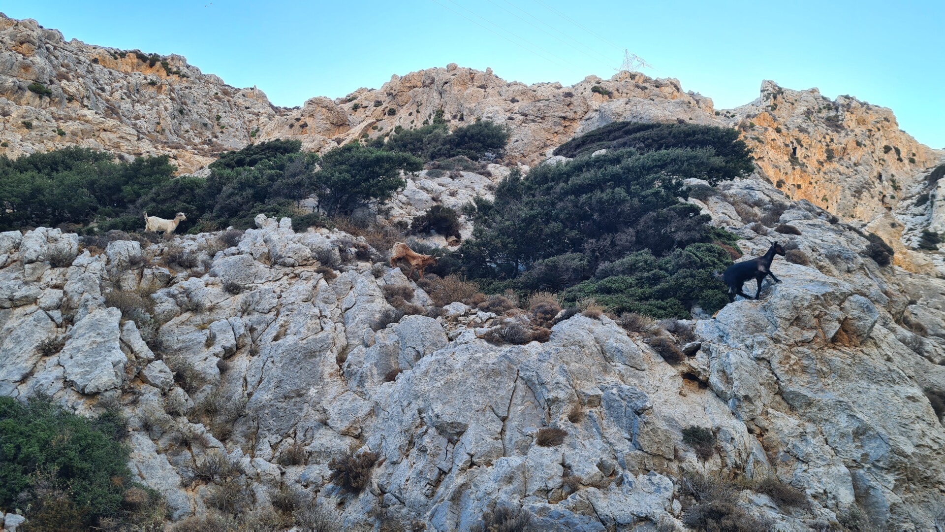 Trochę ponad 4 km wąwozu i przewyższenie ok. 340m daje średnie nachylenie na poziomie 10%, ale miejscami potrzebne Wam będą ręce do podciągania i pokonywania skał i ogromnych kamieni. Niektóre zbocza są o wiele bardziej strome niż te średnie 10%. Z pewnością trochę energii trzeba włożyć w ten odcinek szlaku. Szczęśliwie wysokie ściany wąwozu praktycznie cały czas chroniły mnie od słońca, które ciągle było zbyt nisko. To naprawdę ułatwiło sprawę. Spacer w samo południe oznaczyłby skalną patelnię ze słońcem na plecach praktycznie przez cały czas przemarszu. Przejście wąwozu zajęło mi ok. 1,5h – gdyby nie szukanie kropek, pewno udałoby się szybciej. Przyznam jednak, że tempo miałem żwawe i skakałem z kamienia na kamień jak dzikie kozy, których spotkałem kilkadziesiąt na ok. 3-cim kilometrze, które stojąc na prawie pionowych ścianach wąwozu wpatrywały się we mnie w bezruchu. Creepy 🙂
