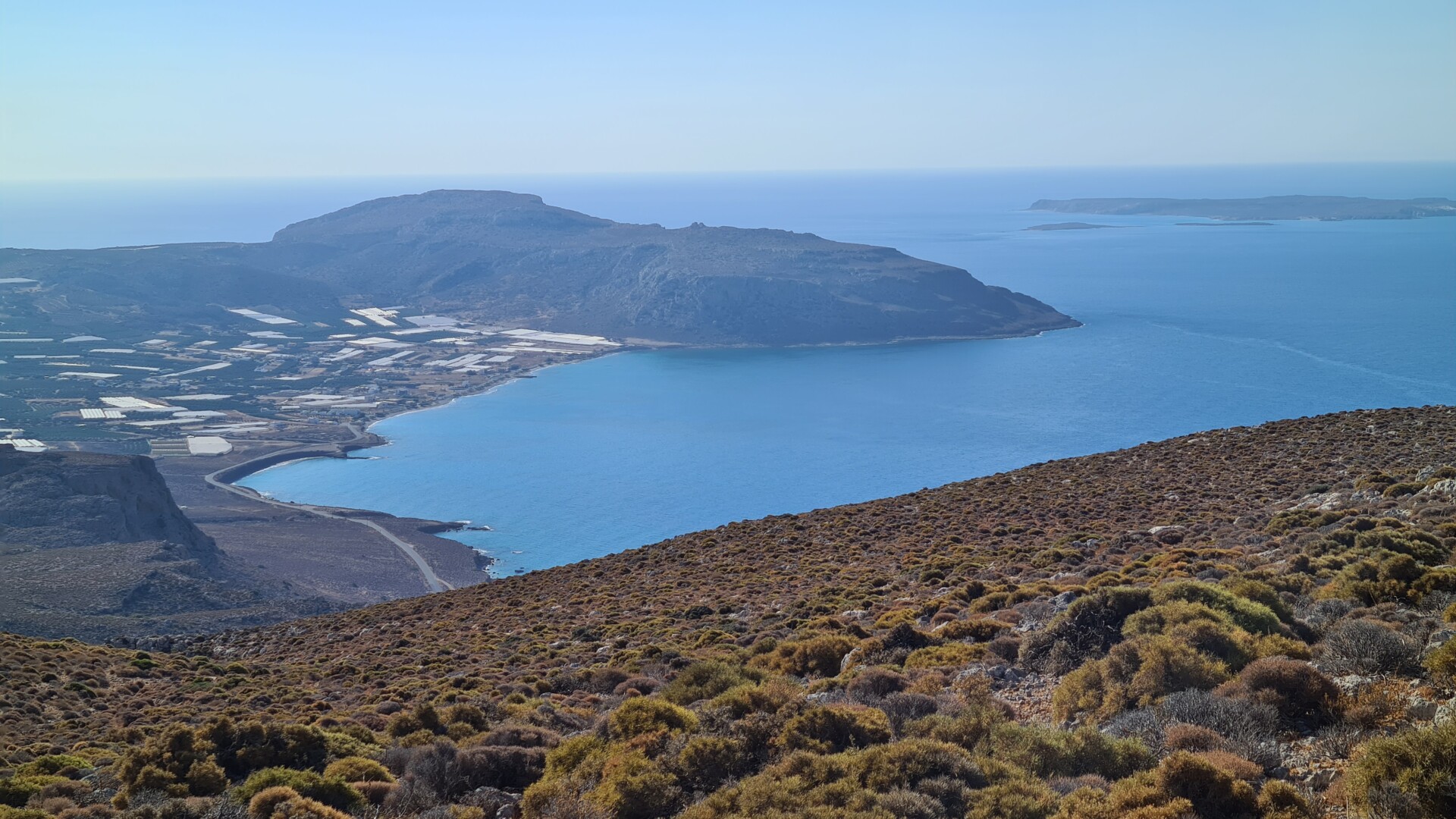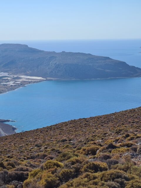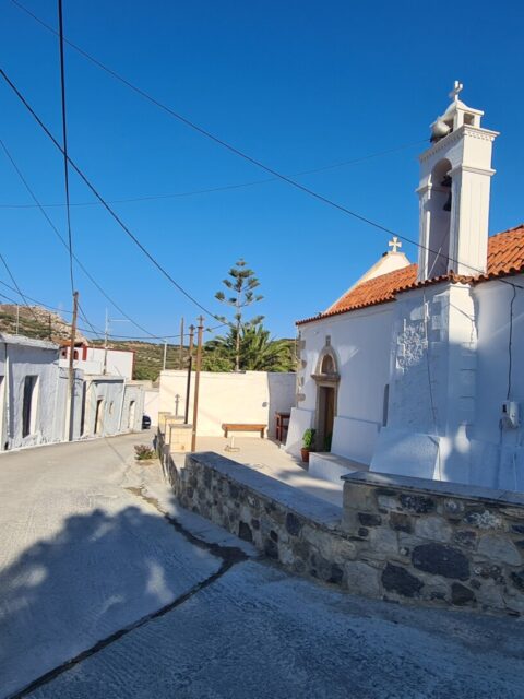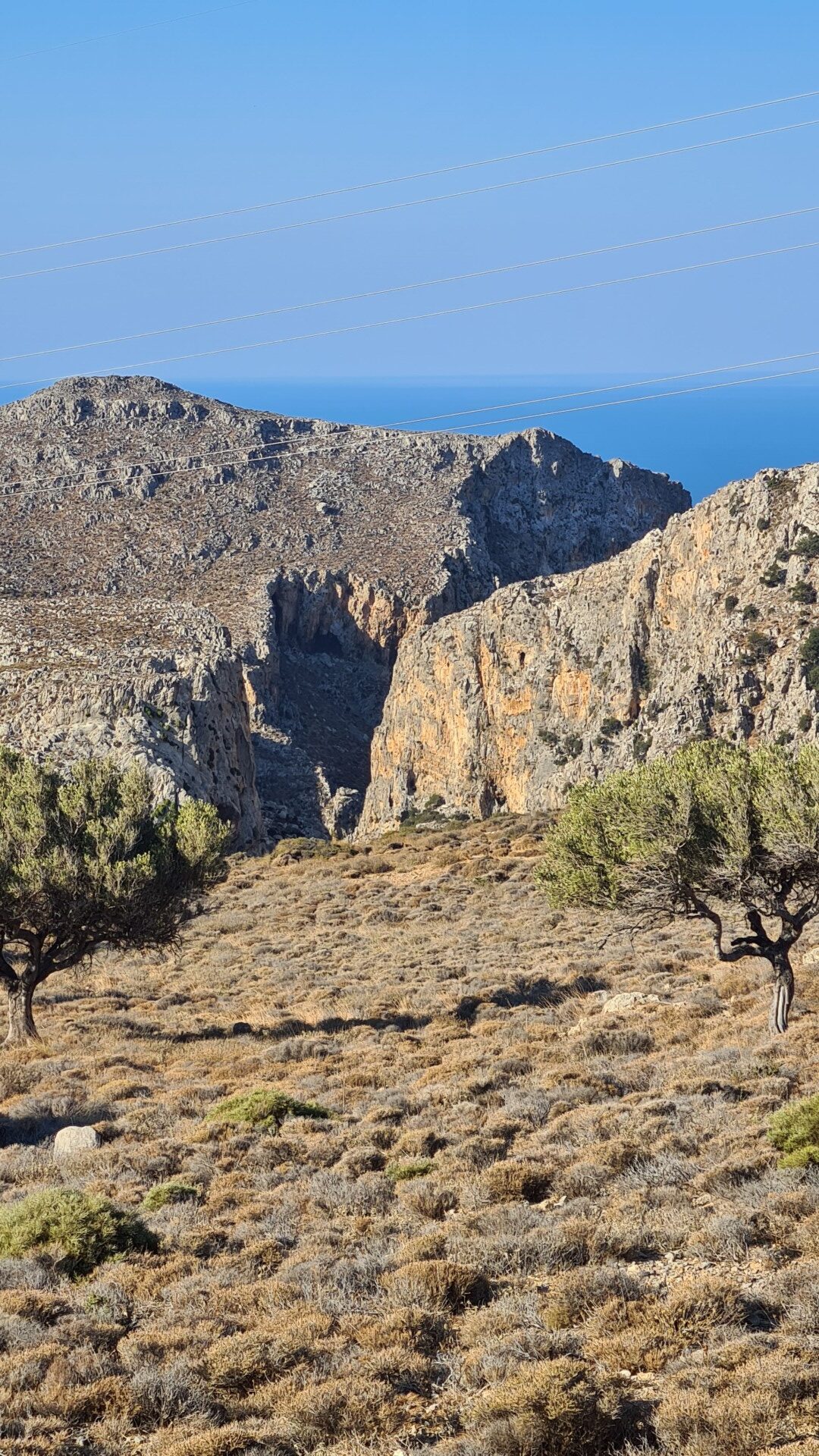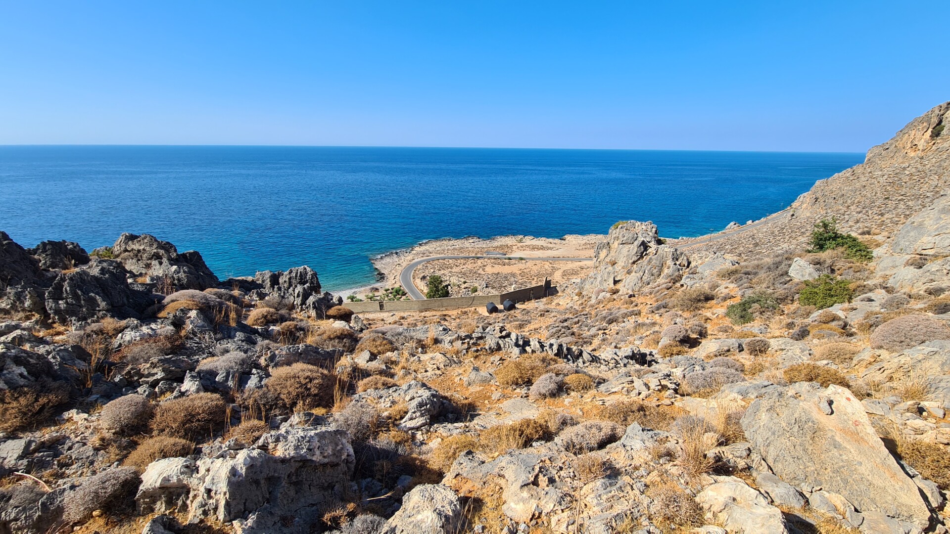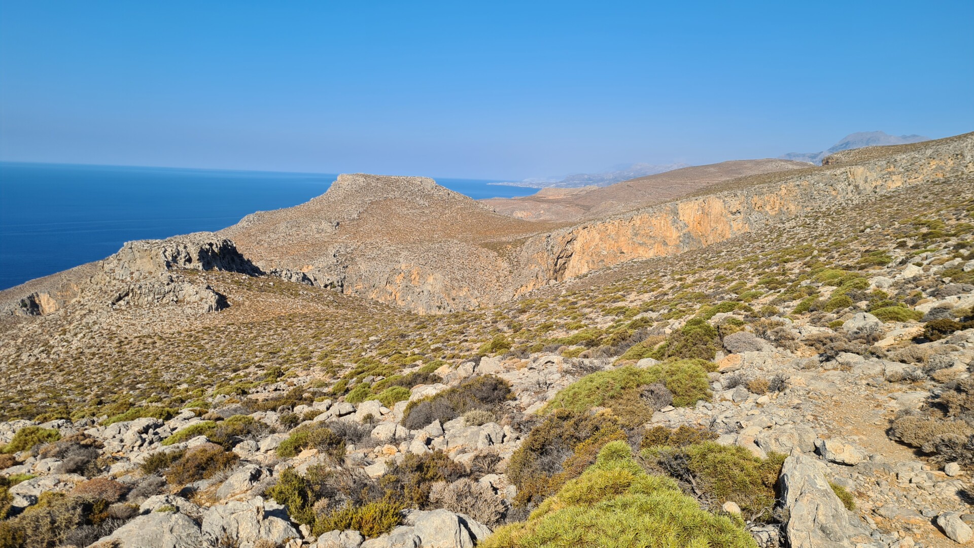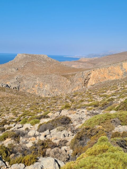 Po wyjściu z wąwozu trochę pobłądziłem naruszając tereny prywatne – pobliskie sady, ale finalnie dotarłem do malutkiej, bardzo klimatycznej wioski Perivolakia, skąd skierowałem swoje kroki najpierw na wschód, a następnie na południe polną drogą, która wyniosła mnie nad wąwóz. Ścieżka prowadzi jednak w znacznej odległości od urwisk, więc nie trzeba obawiać się ekspozycji. Zapewne można próbować podejść bliżej, ale ja wolałem trzymać się założonego planu. W pewnym momencie (dzięki śladom GPX wiedziałem gdzie), polną drogę zamieniamy na zlewającą się z krajobrazem ścieżkę pomiędzy kamieniami i wysuszoną na wiór niską roślinnością. Naszym oczom też powoli ukazuje się bezkres morza libijskiego. Zapach ziół, słońce, błękity i ta surowa jałowa ziemia potrafią przyprawić o zawrót głowy. Byłem tak nieobecny myślami i skoncentrowany na identyfikowaniu ścieżki, że w ostatniej chwili i kątem oka zobaczyłem, że przeszedłem tuż obok turystów, którzy wychodzili z czegoś na kształt jaskini na średnio-stromo opadającym zboczu w kierunku wybrzeża. Tak się przestraszyłem , że ktoś nagle wyrósł niespodziewania na trasie, że zamiast zatrzymać się i pójść zobaczyć jaskinię przyspieszyłem tylko kroku. Trochę żałuję, bo lubię takie krajobrazowe niespodzianki na szlaku, a na mapach nie była ona oznaczona. Zresztą trochę wcześniej, tuż za wioską był kierunkowskaz do Vornofeto Cave. Niestety brak informacji jak daleko się ona znajduje plus praktycznie zero informacji w sieci na jej temat spowodowała, że także się do niej nie pofatygowałem.