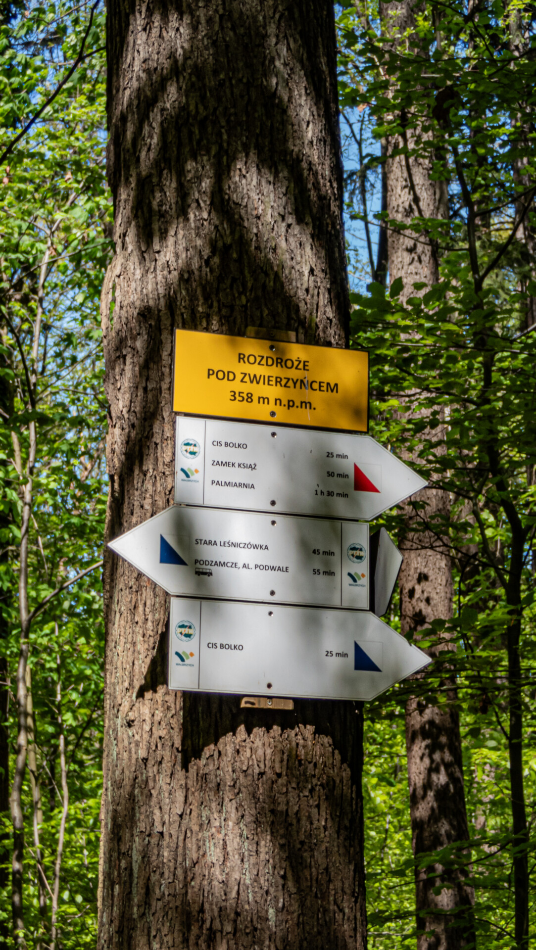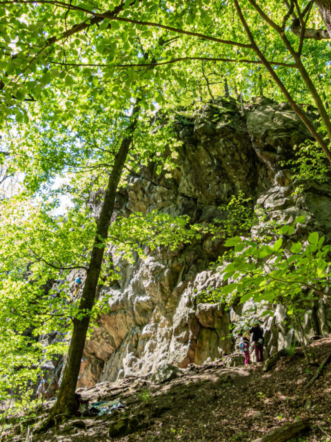 Tego dnia, po zdobyciu zatłoczonej Wielkiej Sowy, mieliśmy w planie jeszcze wizytę na Zamku Książ. Ruszyliśmy w stronę Wałbrzycha, ale zanim dotarliśmy na miejsce, gigantyczne korki szybko uświadomiły nam, że zwiedzanie zamku może się okazać… niemożliwe. Trwał akurat Festiwal Kwiatów i Sztuki, a zainteresowanie imprezą zdecydowanie przerosło możliwości organizatorów – zaparkowanie gdziekolwiek graniczyło z cudem. Stojąc w niekończącym się sznurze aut, błyskawicznie przearanżowałem trasę: zamiast zamku – pętla po drugiej stronie Pełcznicy, przez Rezerwat Przełomy z wizytą w ruinach Starego Książa. Nawet tu znalezienie miejsca przy ul. Solnej nie było łatwe, ale finalnie się udało – i ruszyliśmy na czerwony szlak spacerowy.
