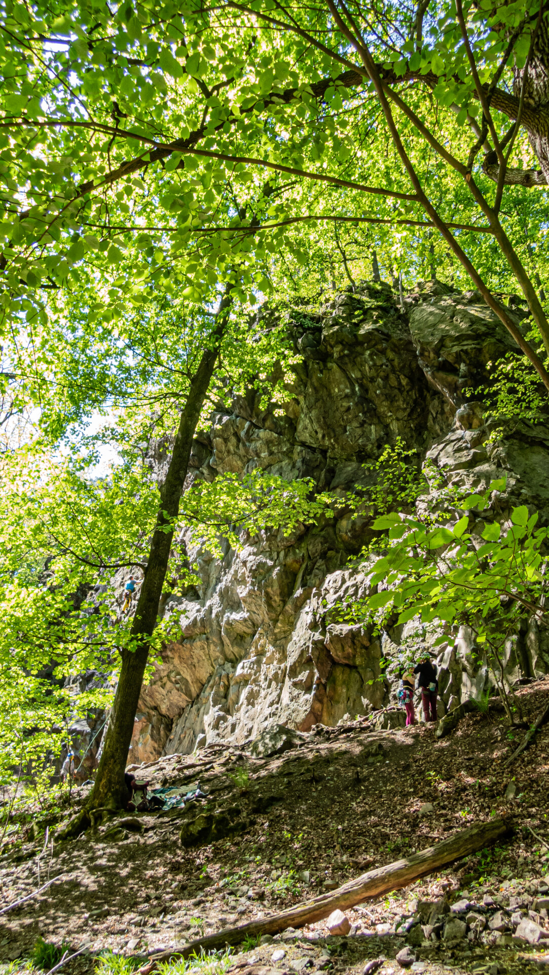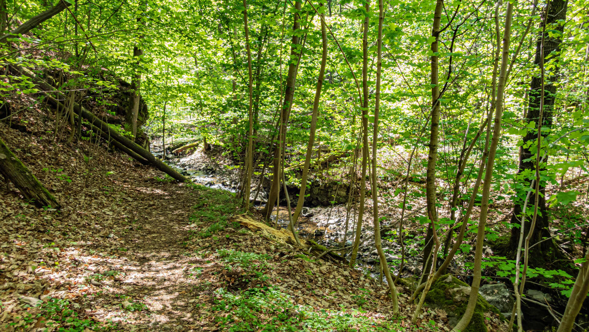 Czerwona ścieżka okazała się zaskakująco trudna w nawigacji. Długo kręciliśmy się wokół potoku Szczawnik i skałek Zwierzyniec, próbując odnaleźć przejście na drugi brzeg. Okazało się, że mostu już nie ma – i nie pozostał po nim nawet ślad. Ostatecznie udało się przejść suchą stopą i kontynuować trasę.