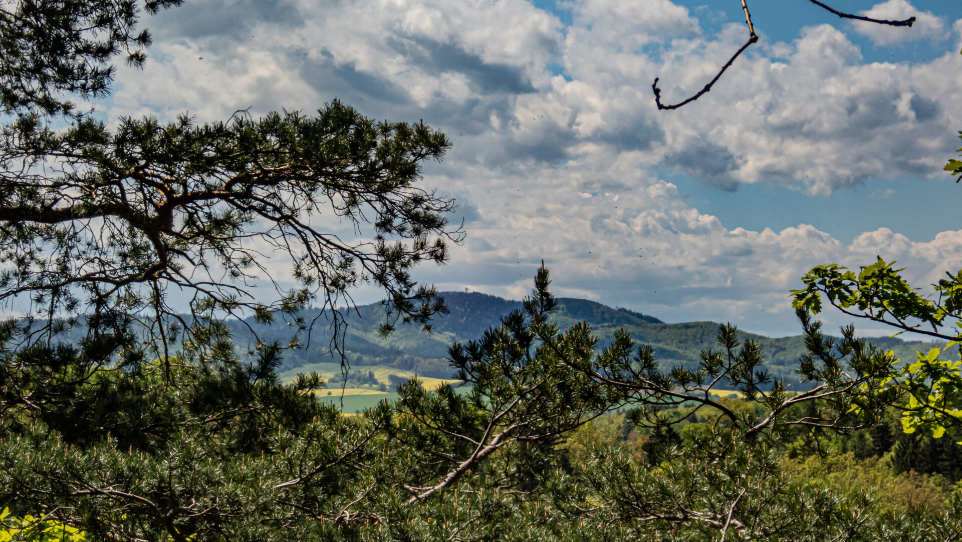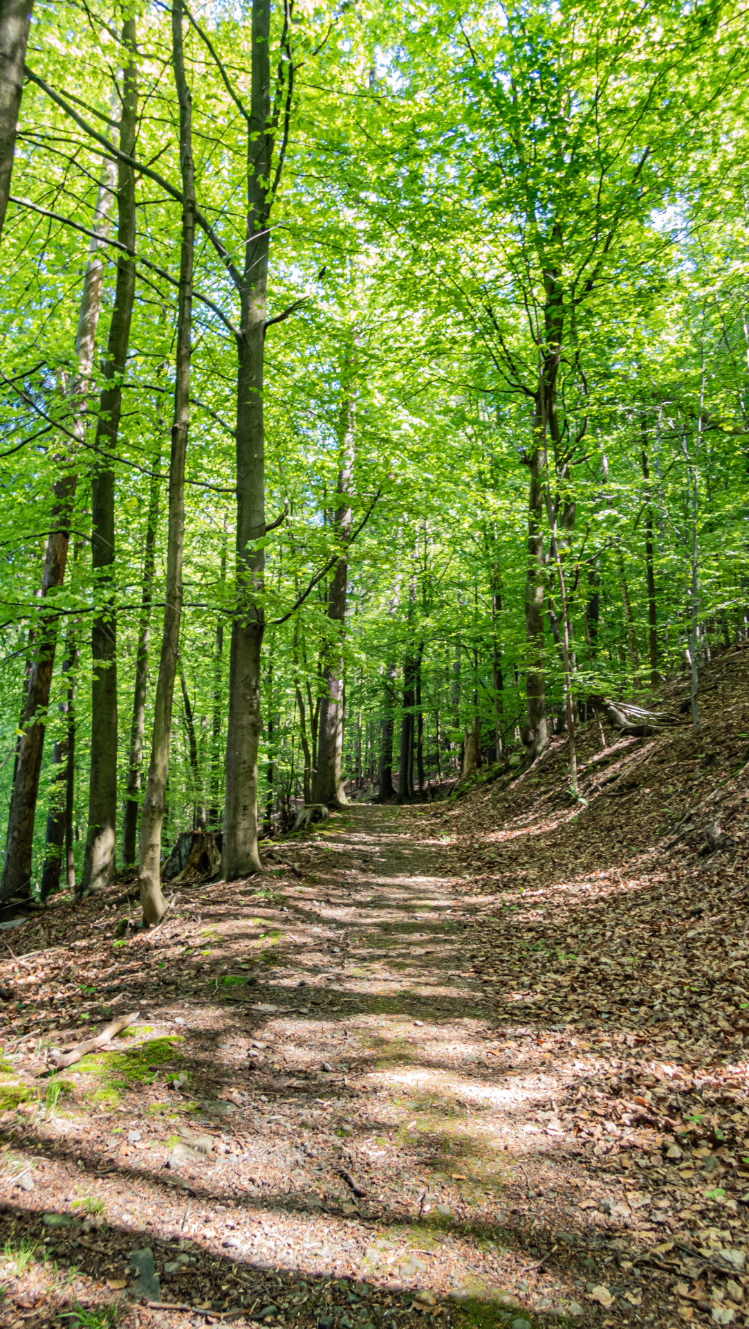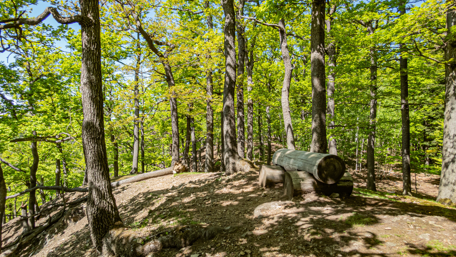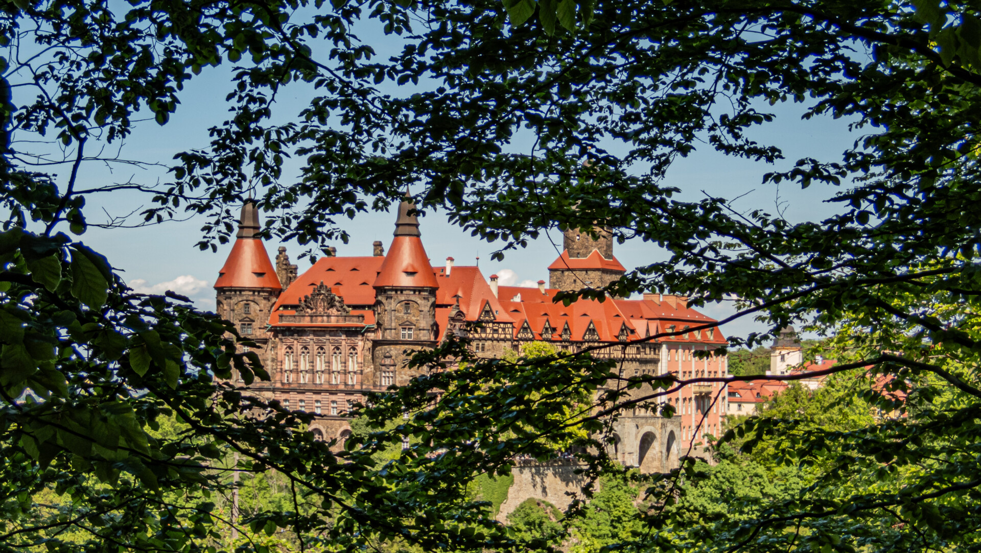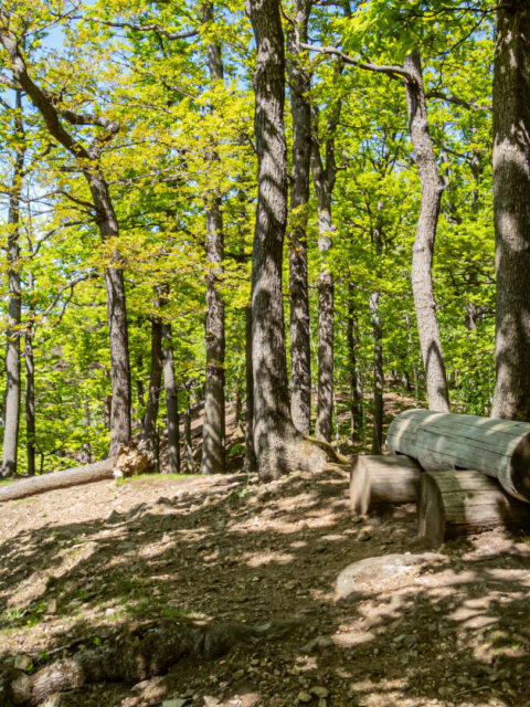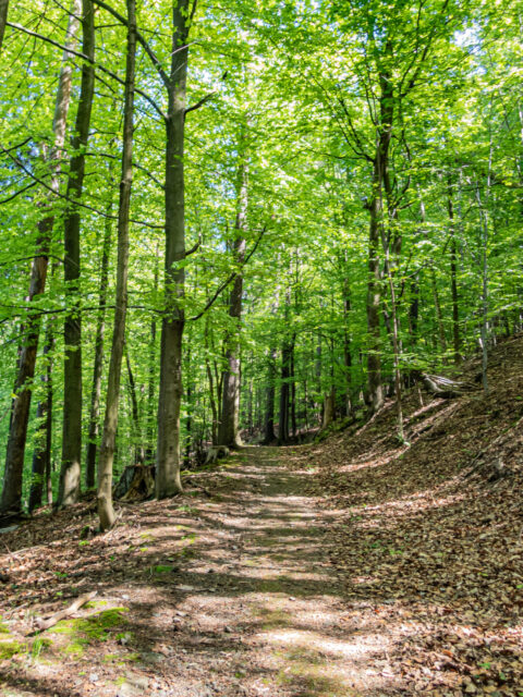 Dalszy odcinek był już intuicyjny. Leśny dukt o średnim nachyleniu ~6% nie sprawiał trudności, a mimo upału drzewa skutecznie chroniły przed słońcem. Po około 35 minutach (na 2. kilometrze) trafiliśmy na urokliwy punkt widokowy z ławeczką, nieoznaczony na popularnych mapach. Pół kilometra dalej – pierwszy rzut oka na Zamek Książ między koronami drzew. Widok ten towarzyszył nam jeszcze kilkukrotnie w drodze do ruin Starego Książa.