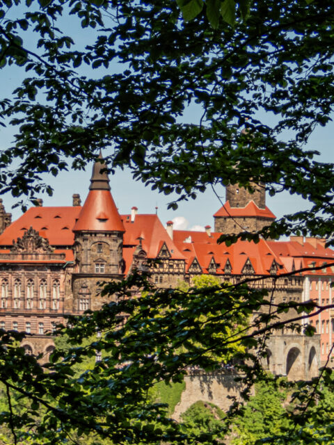 Choć do głównego Zamku Książ nie dotarliśmy, spacer przez Rezerwat Przełomy pozwala zobaczyć go z dystansu – i w spokoju. Ruiny Starego Książa mają interesującą historię: to nie średniowieczna twierdza, lecz romantyczna ruina stworzona przez Hochbergów jako folly – dekoracja krajobrazowa. Uwaga: dostępność trasy może być ograniczona przy wysokim stanie wód lub dużych imprezach.