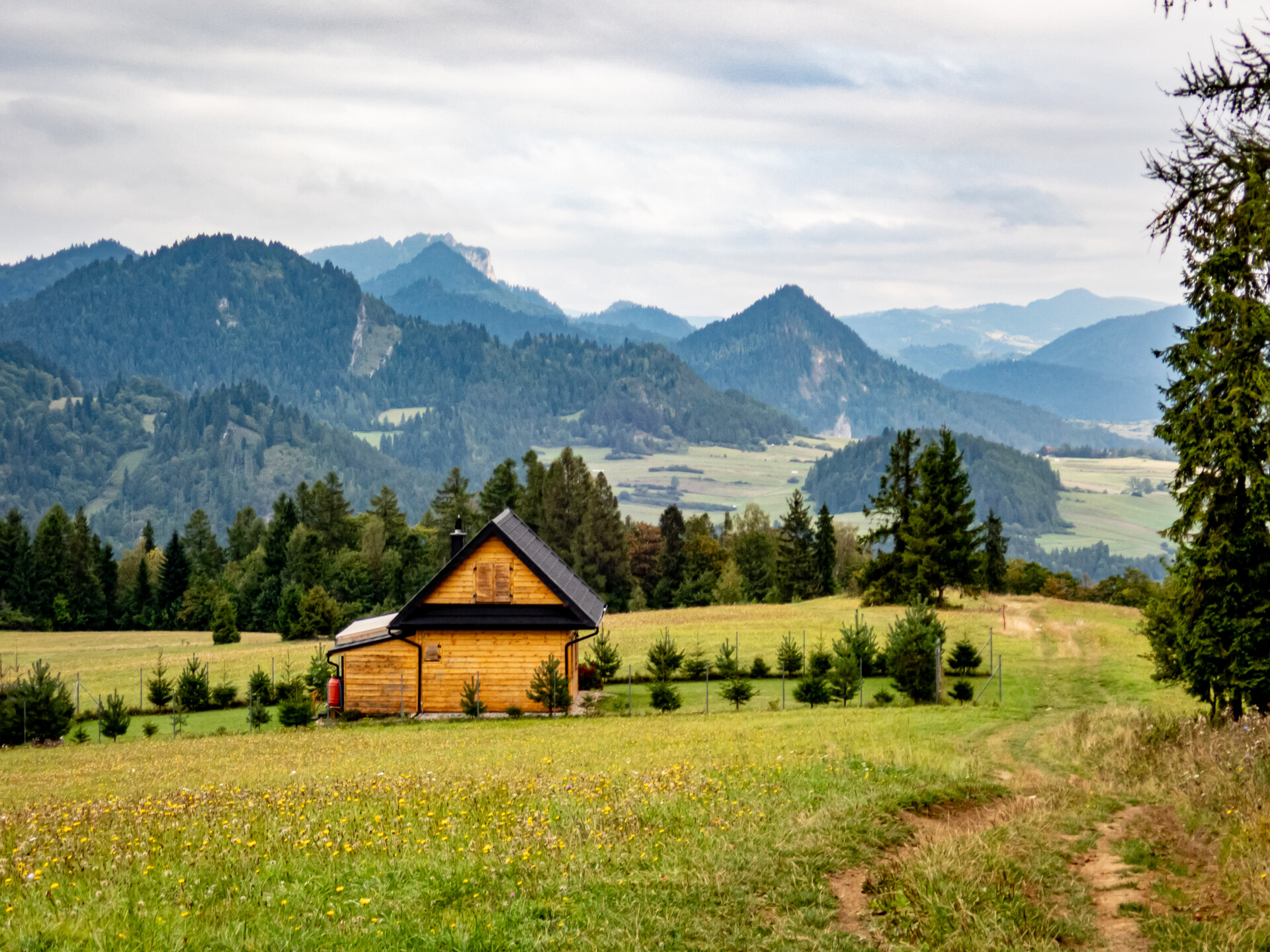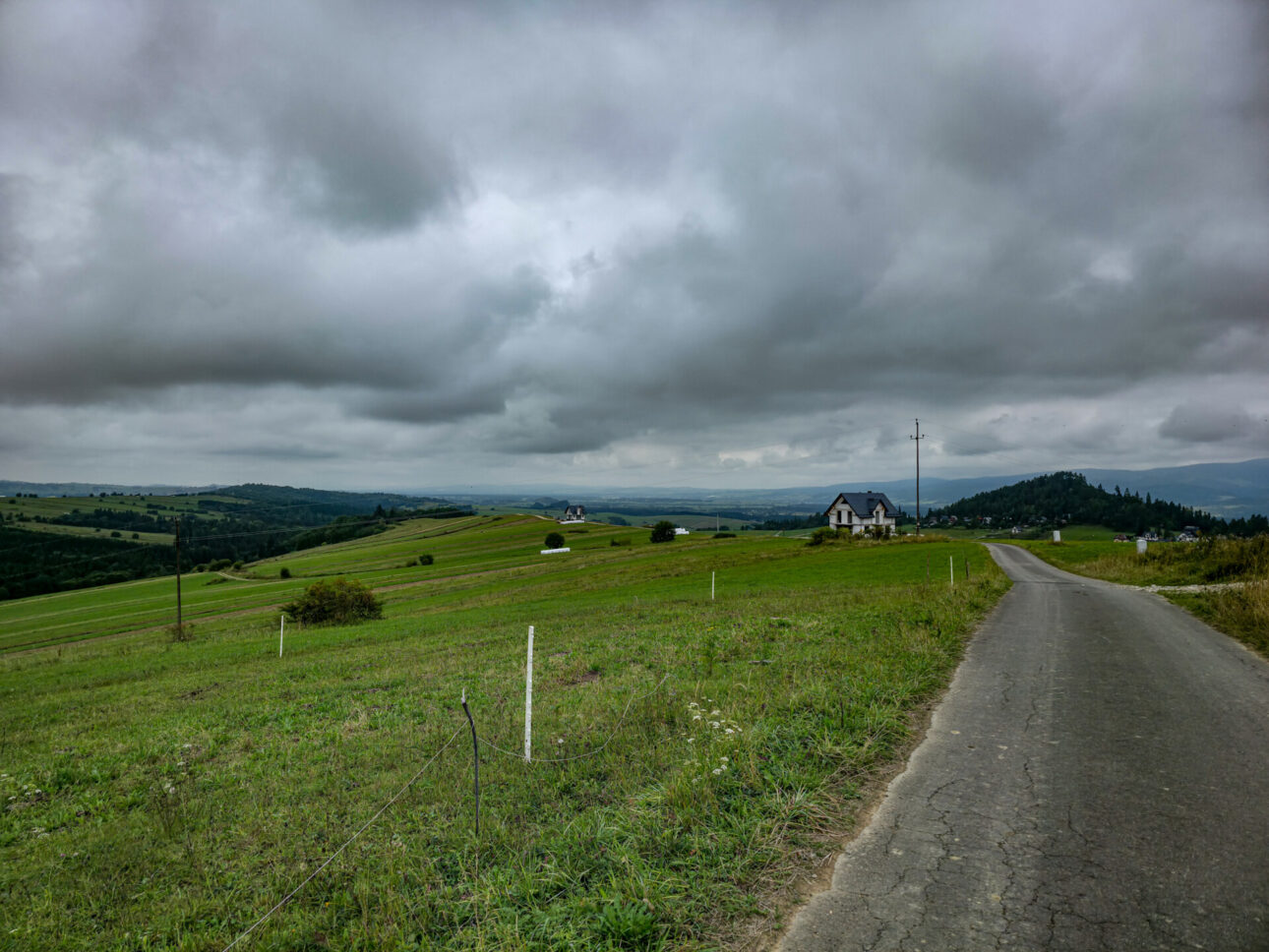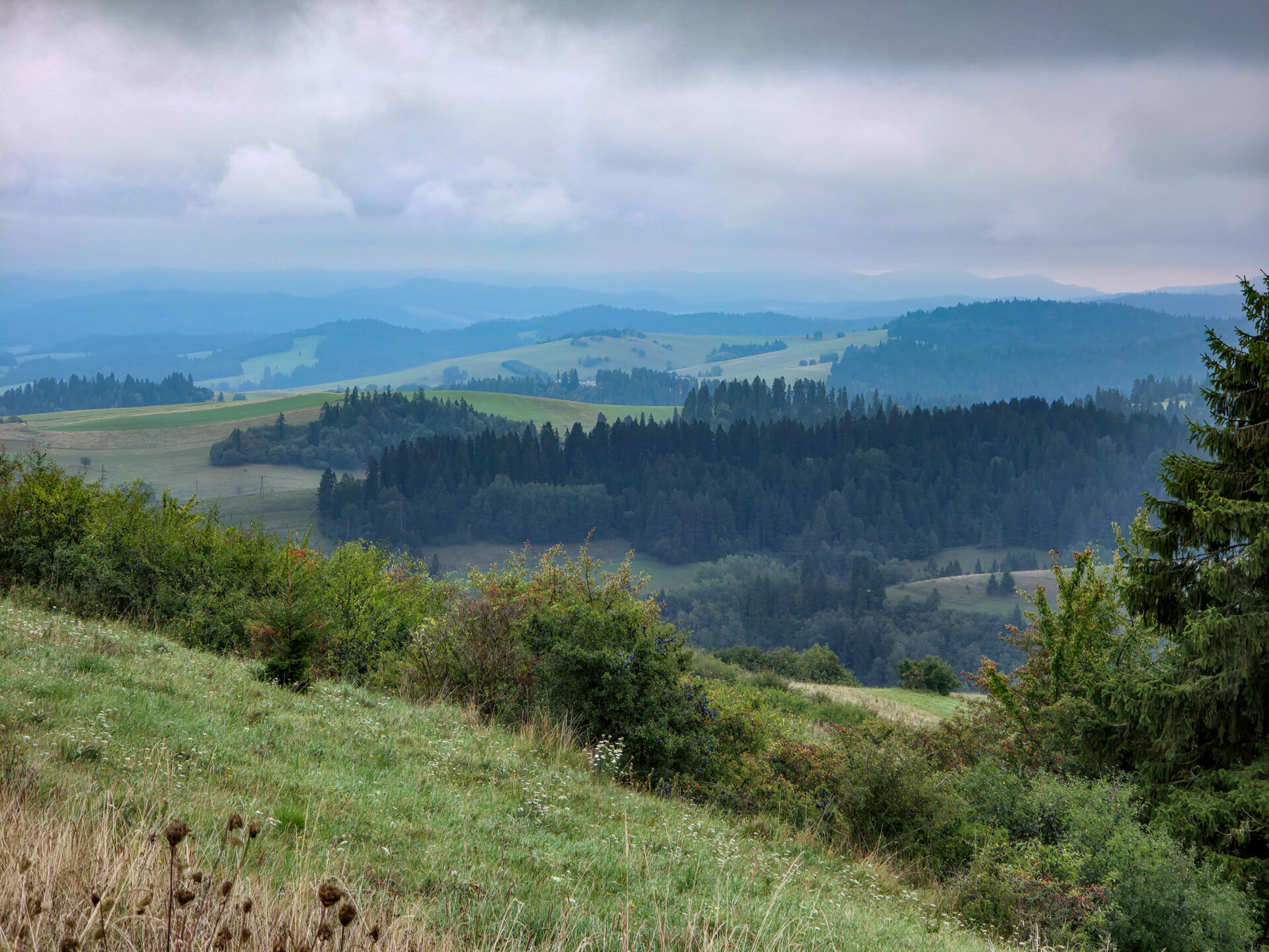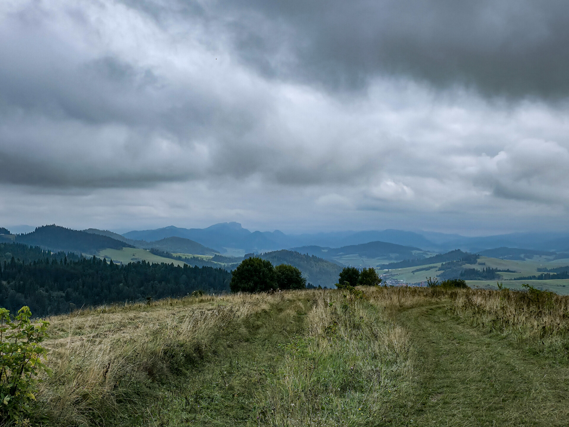 Tak jak przewidywałem, pogoda nie dała nam najmniejszych szans na panoramę Tatr z Grandeusa. Góry oddzielała od nas gruba warstwa niskich chmur. Jedynie Pieniny majaczyły na wschodnim horyzoncie wraz z charakterystyczną sylwetą Trzech Koron. W dodatku pod wieżą przekaźnikową oraz wiatą na szczycie swoje spotkanie urządzili sobie miejscowi fani quadów, więc od razu ruszyliśmy dalej czerwonym szlakiem na północ w kierunku Dursztyna. Szlak wiedzie obok Kalotów Wierch (na który dotarliśmy wyraźnie przetartą szeroką ścieżką), a następnie wzdłuż ulicy Długiej, którą docieramy do centrum Dursztyna. Obok Kościoła św. Jana Chrzciciela skręcamy na wschód w ulicę Pienińską, gdzie czerwony szlak szybko wyprowadza nas poza zabudowania wioski. Naszym oczom ukazał się cudny widok na moje „kieszonkowe góry” Pieniny Spiskie. Malownicze, gęsto utkane wzniesienia, lasy, łąki, małe hale tworzące efekt makiety, który tak bardzo kocham w Pieninach. Docieramy do ostatnich zabudowań i po chwili idziemy wzdłuż linii lasu nad Jurgowskimi Stajniami.
