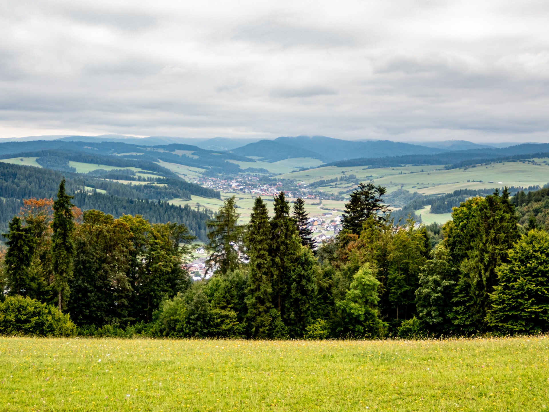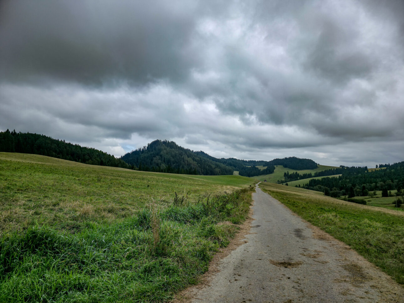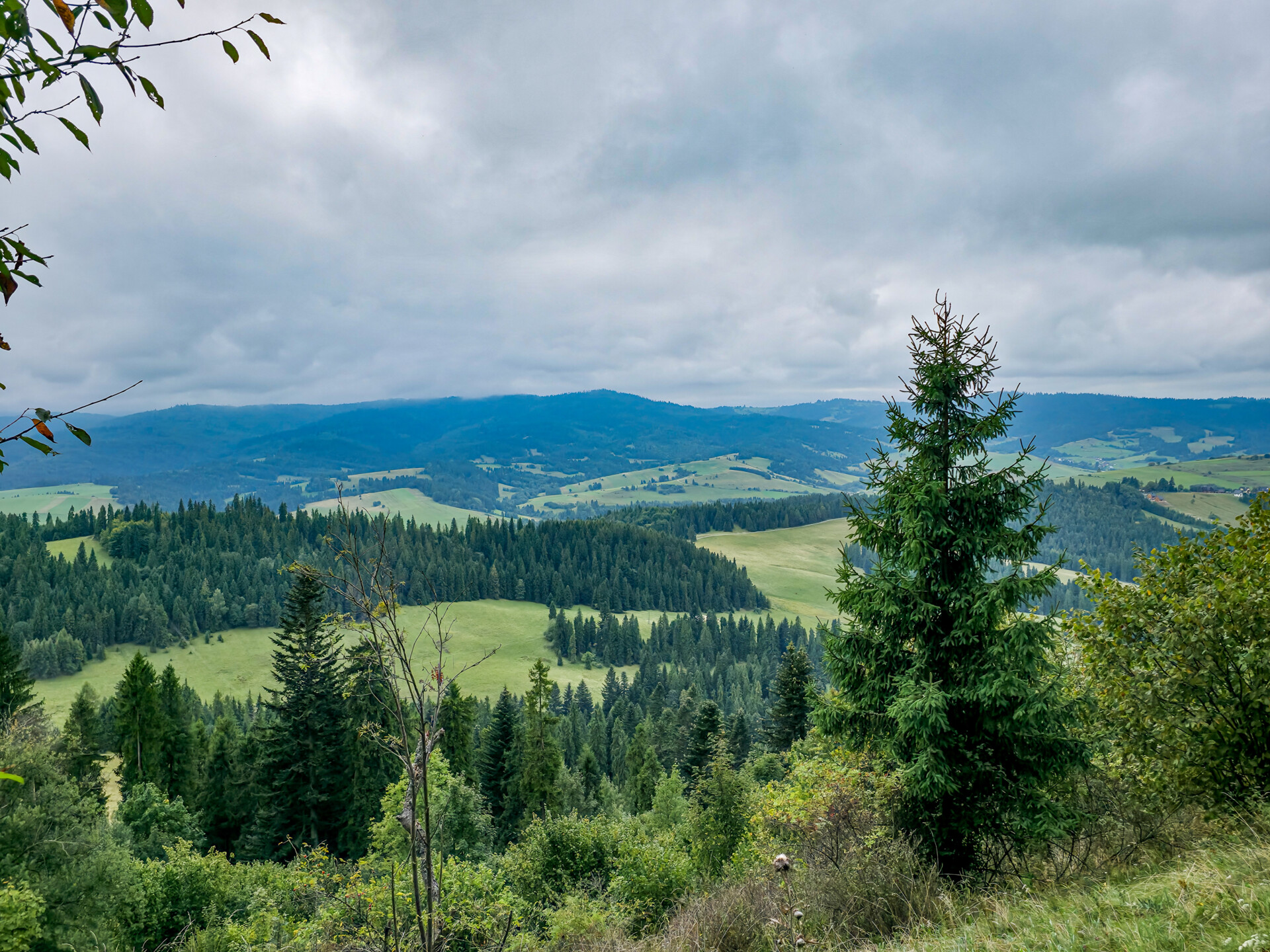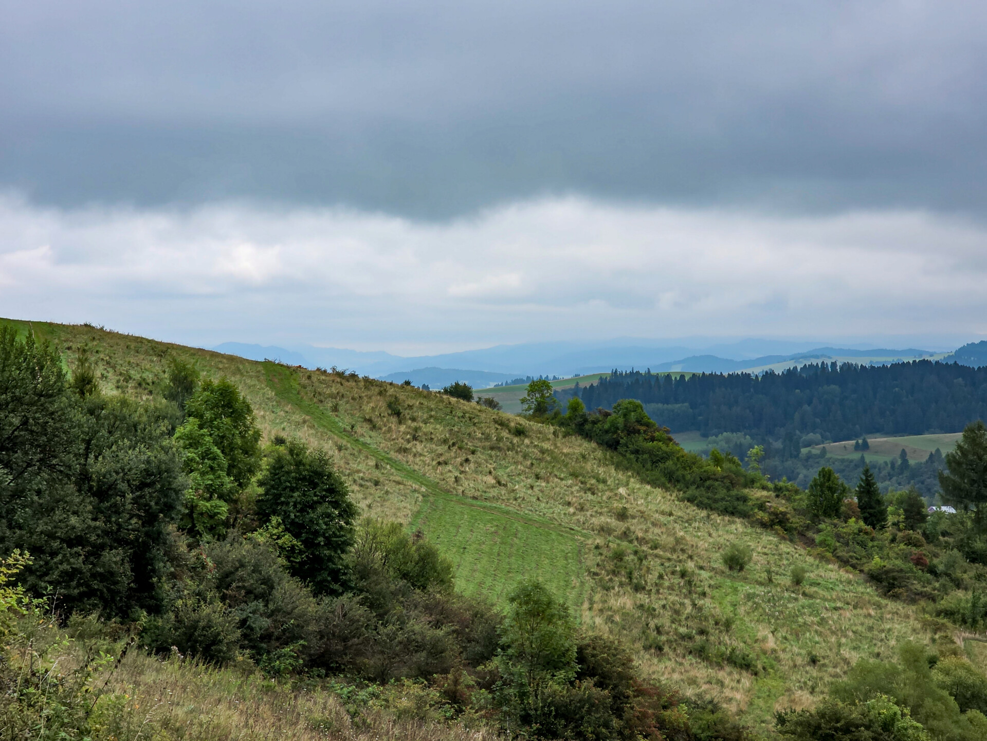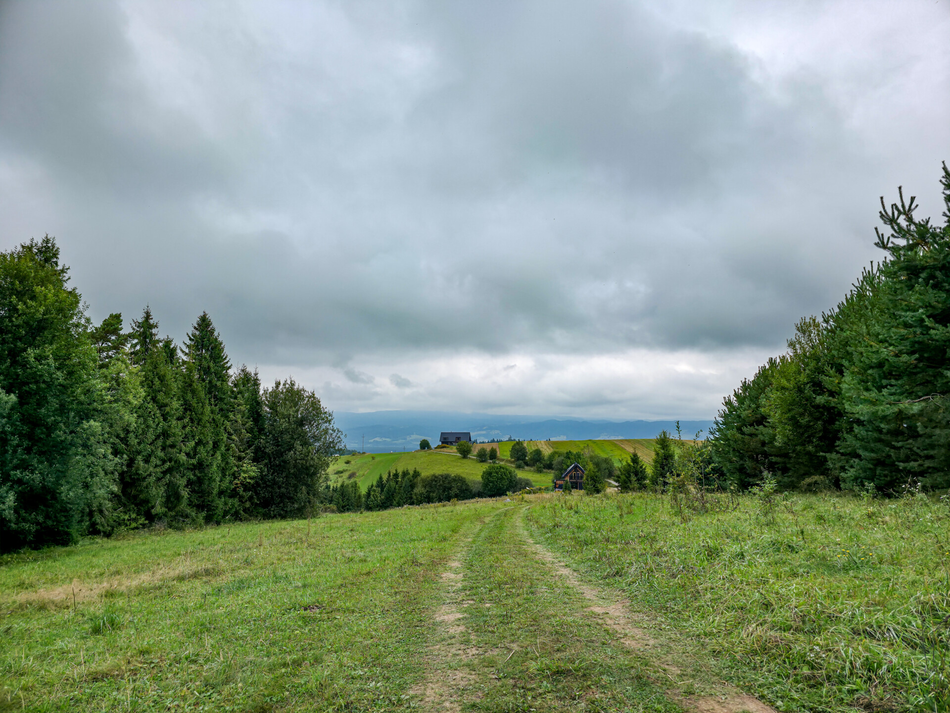Tak jak przewidywałem, pogoda nie dała nam najmniejszych szans na panoramę Tatr z Grandeusa. Góry oddzielała od nas gruba warstwa niskich chmur. Jedynie Pieniny majaczyły na wschodnim horyzoncie wraz z charakterystyczną sylwetą Trzech Koron. W dodatku pod wieżą przekaźnikową oraz wiatą na szczycie swoje spotkanie urządzili sobie miejscowi fani quadów, więc od razu ruszyliśmy dalej czerwonym szlakiem na północ w kierunku Dursztyna. Szlak wiedzie obok Kalotów Wierch (na który dotarliśmy wyraźnie przetartą szeroką ścieżką), a następnie wzdłuż ulicy Długiej, którą docieramy do centrum Dursztyna. Obok Kościoła św. Jana Chrzciciela skręcamy na wschód w ulicę Pienińską, gdzie czerwony szlak szybko wyprowadza nas poza zabudowania wioski. Naszym oczom ukazał się cudny widok na moje „kieszonkowe góry” Pieniny Spiskie. Malownicze, gęsto utkane wzniesienia, lasy, łąki, małe hale tworzące efekt makiety, który tak bardzo kocham w Pieninach. Docieramy do ostatnich zabudowań i po chwili idziemy wzdłuż linii lasu nad Jurgowskimi Stajniami.