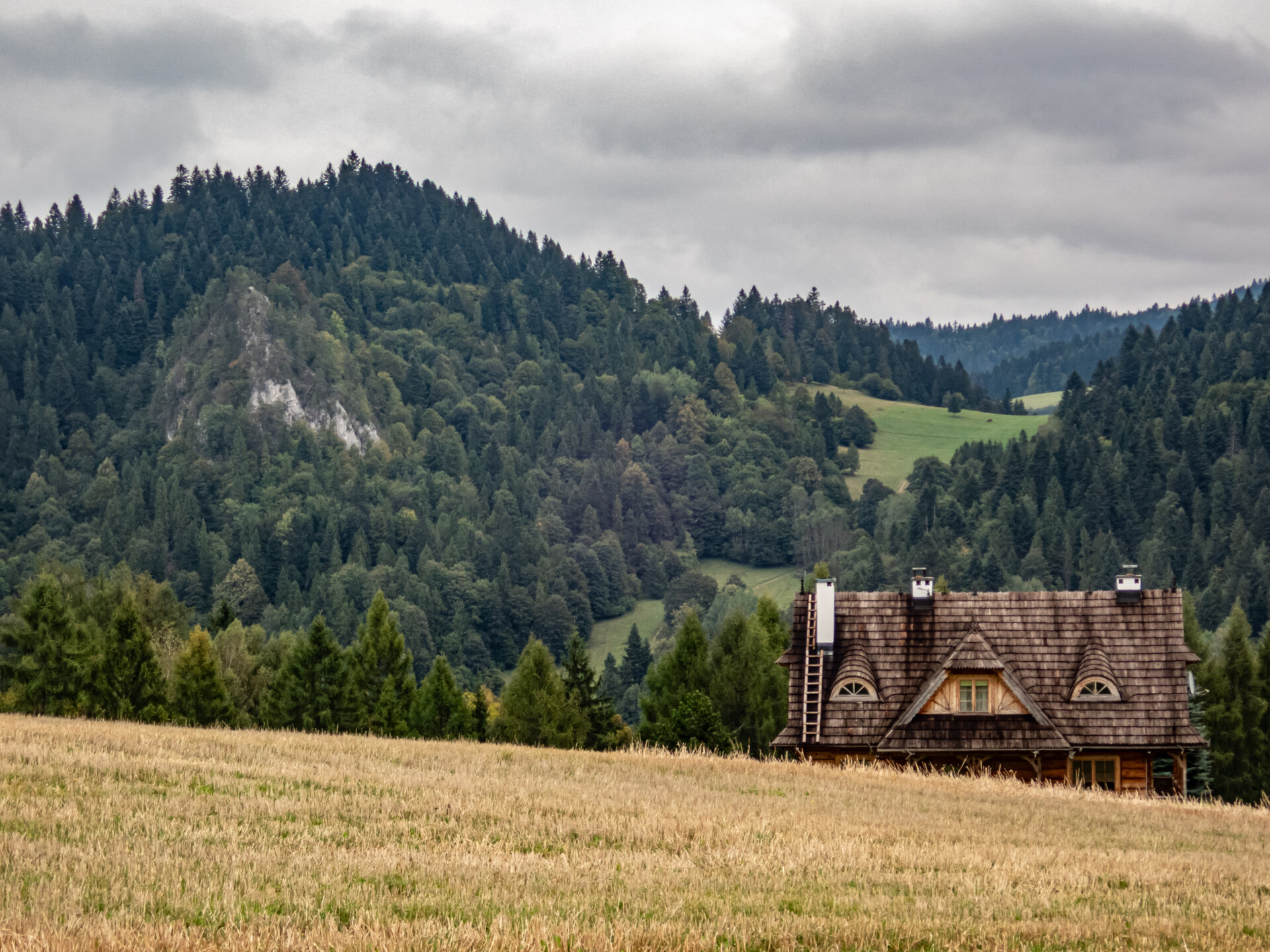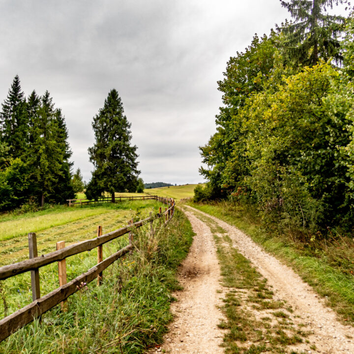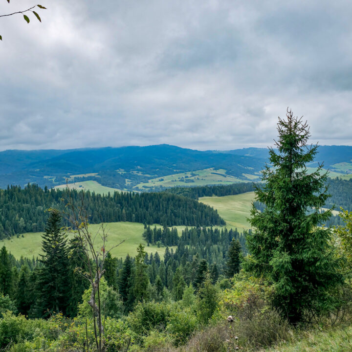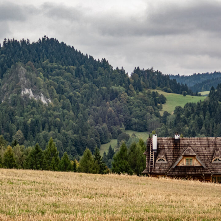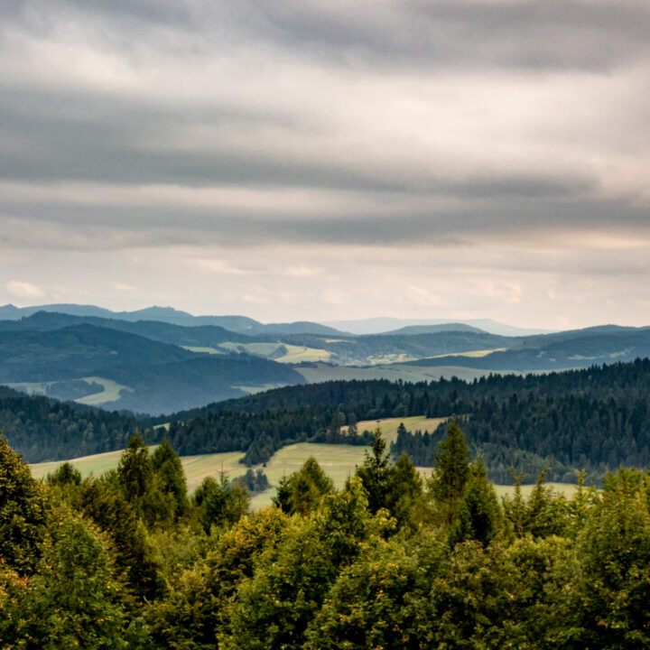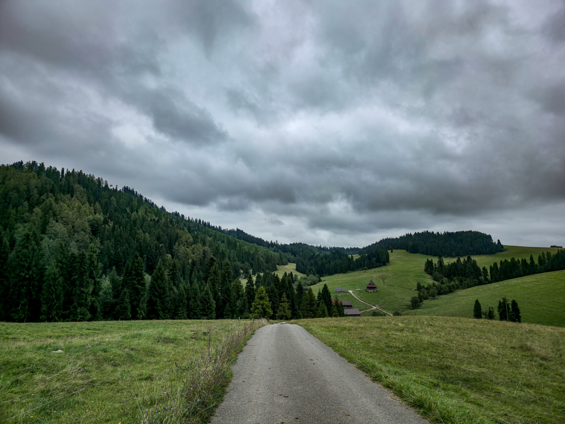 Tak jak przewidywałem, pogoda nie dała nam najmniejszych szans na panoramę Tatr z Grandeusa. Góry oddzielała od nas gruba warstwa niskich chmur. Jedynie Pieniny majaczyły na wschodnim horyzoncie wraz z charakterystyczną sylwetą Trzech Koron. W dodatku pod wieżą przekaźnikową oraz wiatą na szczycie swoje spotkanie urządzili sobie miejscowi fani quadów, więc od razu ruszyliśmy dalej czerwonym szlakiem na północ w kierunku Dursztyna. Szlak wiedzie obok Kalotów Wierch (na który dotarliśmy wyraźnie przetartą szeroką ścieżką), a następnie wzdłuż ulicy Długiej, którą docieramy do centrum Dursztyna. Obok Kościoła św. Jana Chrzciciela skręcamy na wschód w ulicę Pienińską, gdzie czerwony szlak szybko wyprowadza nas poza zabudowania wioski. Naszym oczom ukazał się cudny widok na moje „kieszonkowe góry” Pieniny Spiskie. Malownicze, gęsto utkane wzniesienia, lasy, łąki, małe hale tworzące efekt makiety, który tak bardzo kocham w Pieninach. Docieramy do ostatnich zabudowań i po chwili idziemy wzdłuż linii lasu nad Jurgowskimi Stajniami.