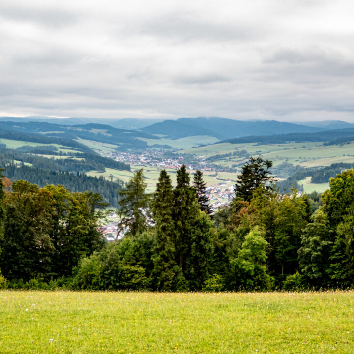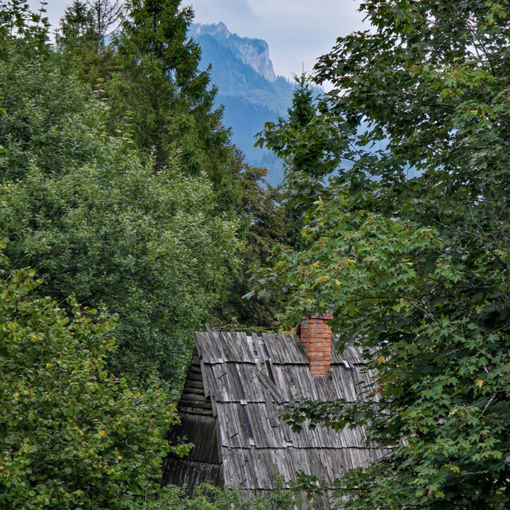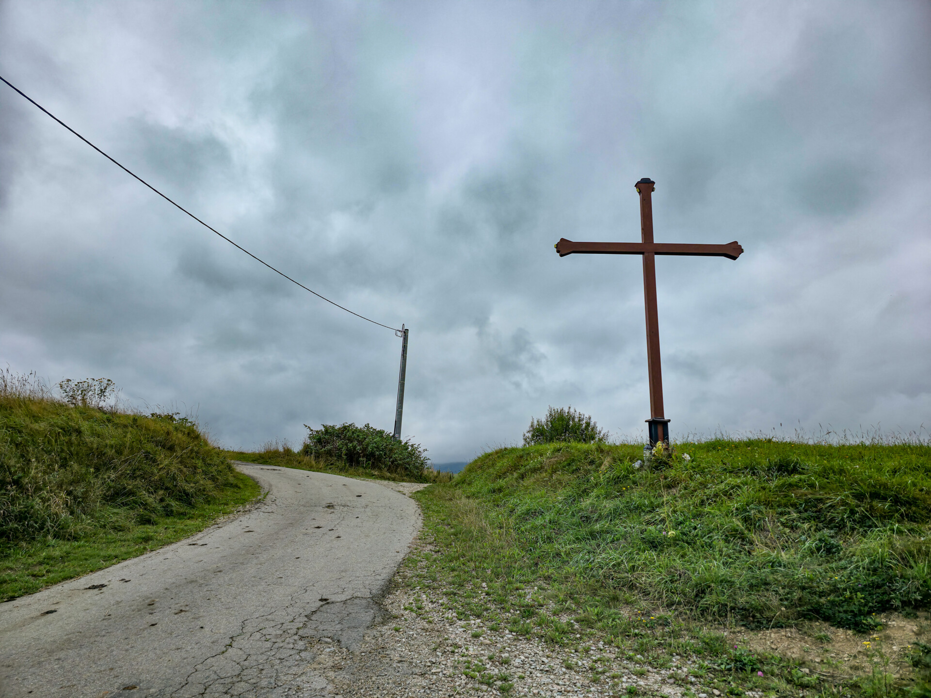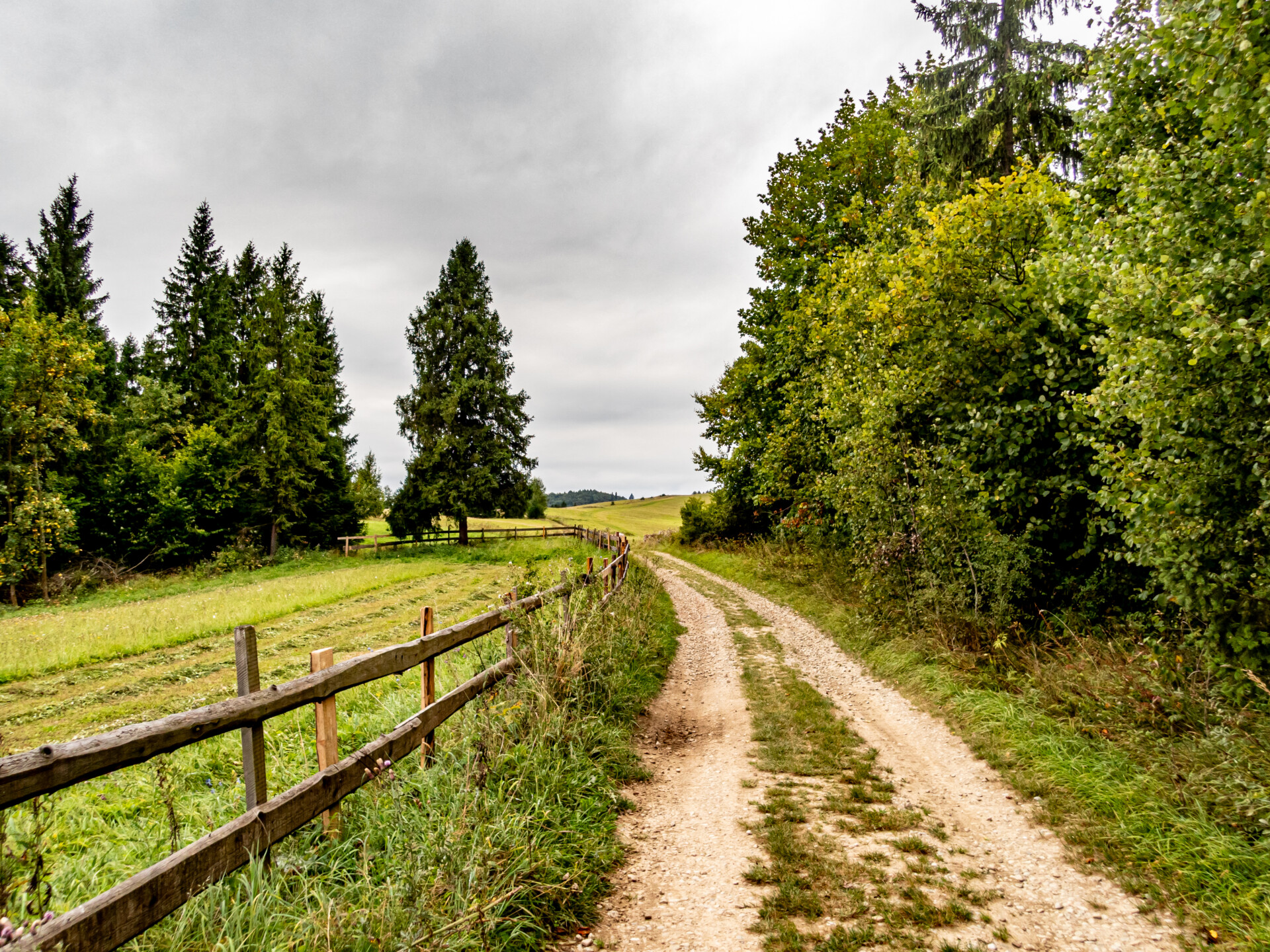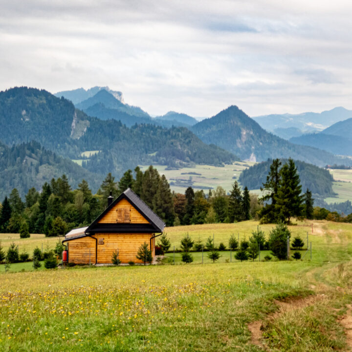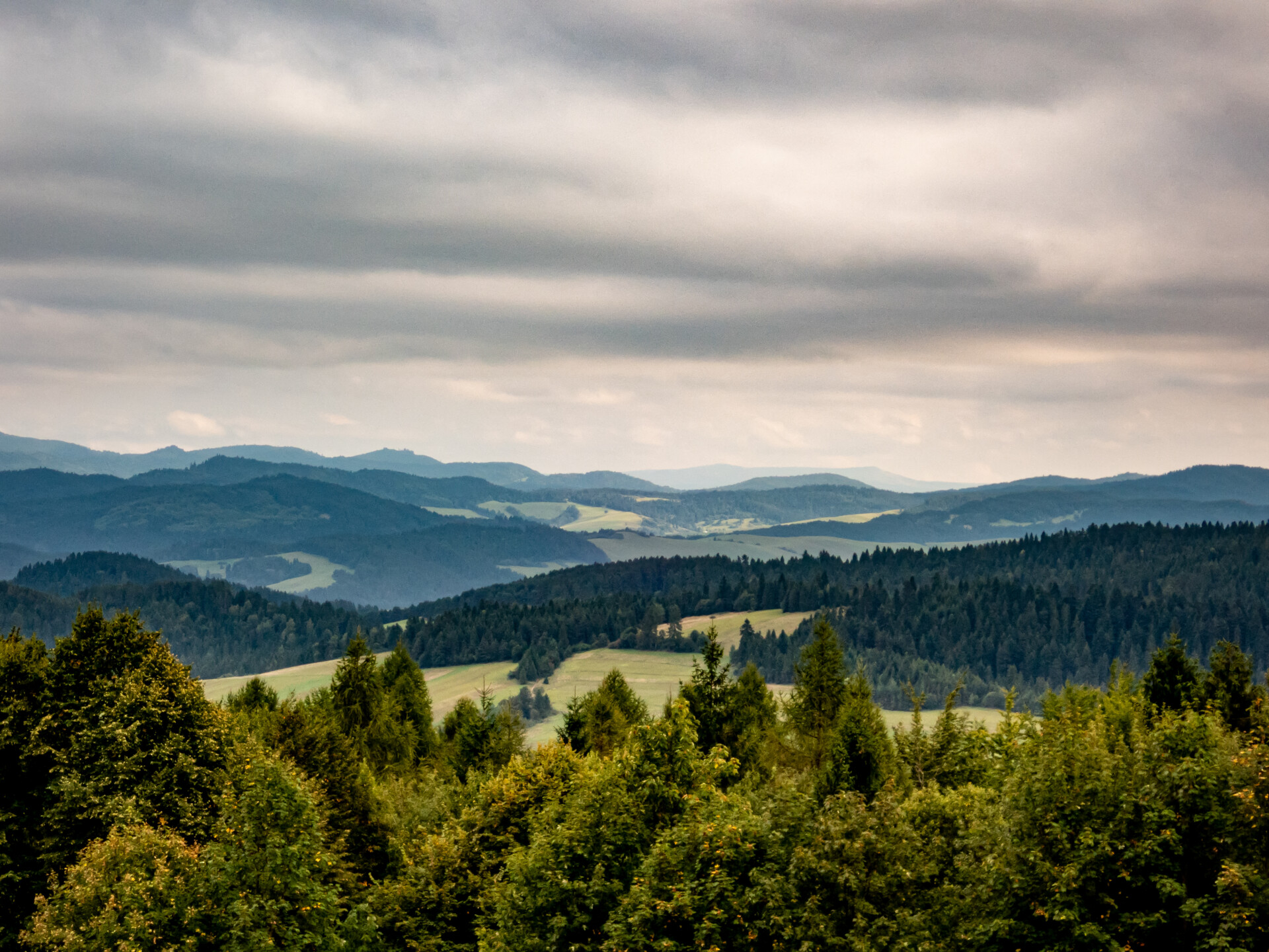 Tak jak przewidywałem, pogoda nie dała nam najmniejszych szans na panoramę Tatr z Grandeusa. Góry oddzielała od nas gruba warstwa niskich chmur. Jedynie Pieniny majaczyły na wschodnim horyzoncie wraz z charakterystyczną sylwetą Trzech Koron. W dodatku pod wieżą przekaźnikową oraz wiatą na szczycie swoje spotkanie urządzili sobie miejscowi fani quadów, więc od razu ruszyliśmy dalej czerwonym szlakiem na północ w kierunku Dursztyna. Szlak wiedzie obok Kalotów Wierch (na który dotarliśmy wyraźnie przetartą szeroką ścieżką), a następnie wzdłuż ulicy Długiej, którą docieramy do centrum Dursztyna. Obok Kościoła św. Jana Chrzciciela skręcamy na wschód w ulicę Pienińską, gdzie czerwony szlak szybko wyprowadza nas poza zabudowania wioski. Naszym oczom ukazał się cudny widok na moje „kieszonkowe góry” Pieniny Spiskie. Malownicze, gęsto utkane wzniesienia, lasy, łąki, małe hale tworzące efekt makiety, który tak bardzo kocham w Pieninach. Docieramy do ostatnich zabudowań i po chwili idziemy wzdłuż linii lasu nad Jurgowskimi Stajniami.