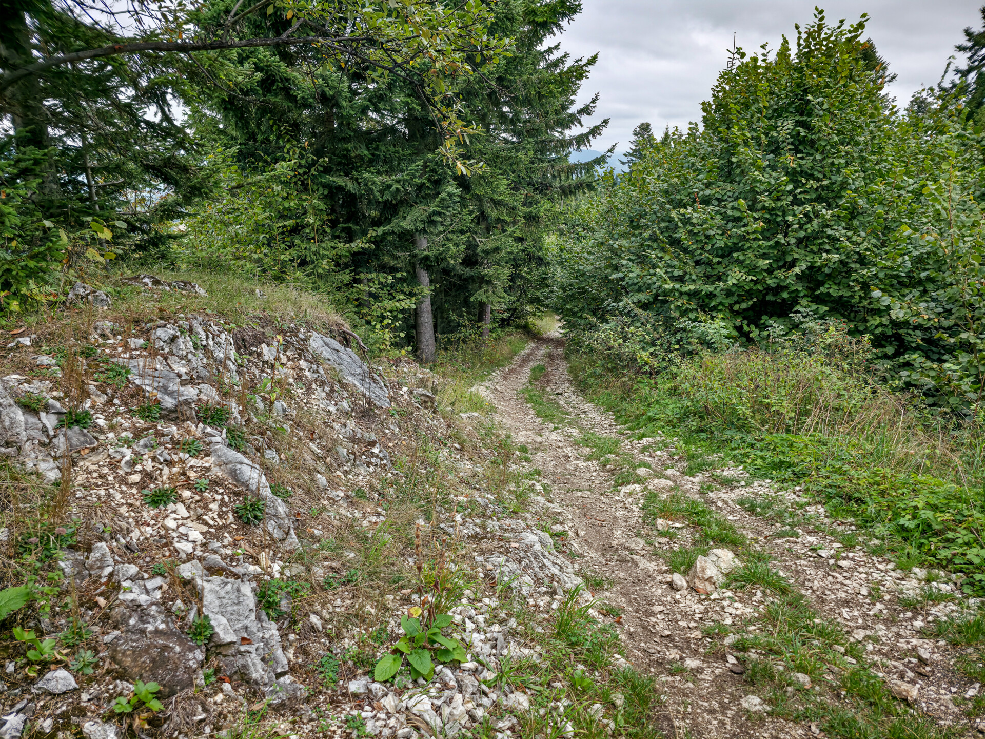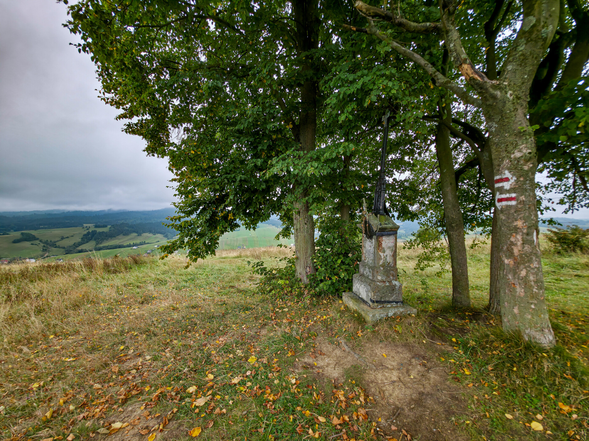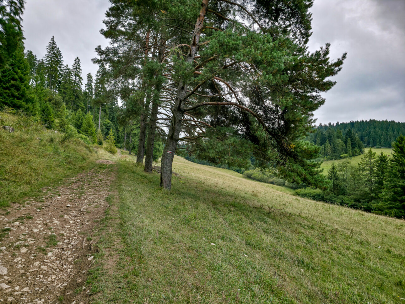 Po krótkiej przerwie ruszyliśmy dalej czerwonym szlakiem, który delikatnie falując wiedzie na wschód w kierunku Niedzicy. Po drodze mijamy nieoznakowany szczyt Szumne 849 m n.p.m., a zaraz za nim docieramy do Polany Wapienne, z której ponownie przy dobrej widoczności rozpościera się szeroki widok na Tatry przez malowniczą Magurę Spiską. Niestety tego dnia pułap chmur skutecznie to uniemożliwiał. Po drodze mijamy Przełęcz Przesła, na której krzyżują się szlak czerwony i żółty (Łapsze Niżne – Falsztyn).