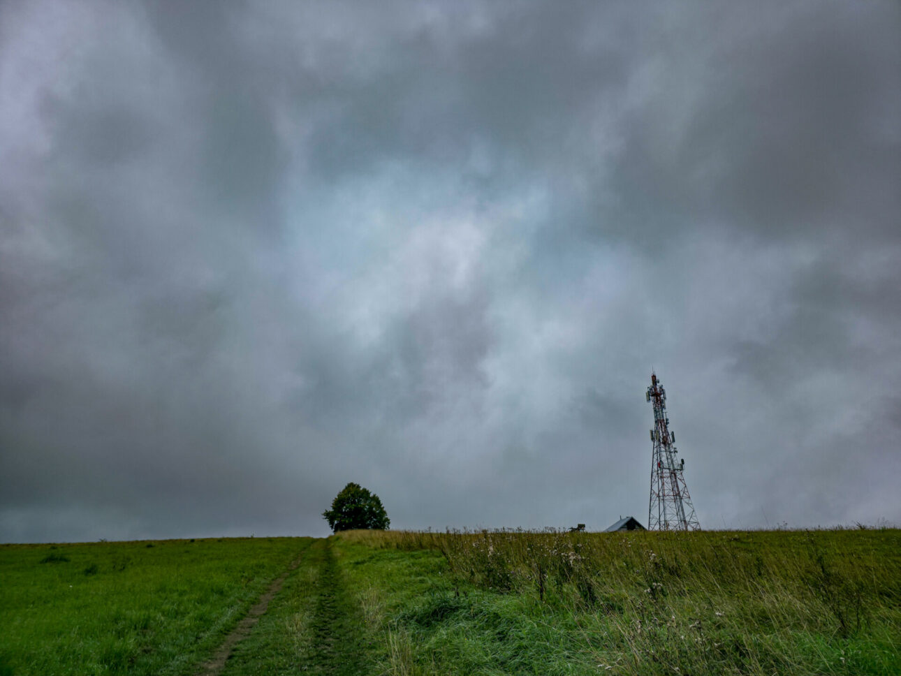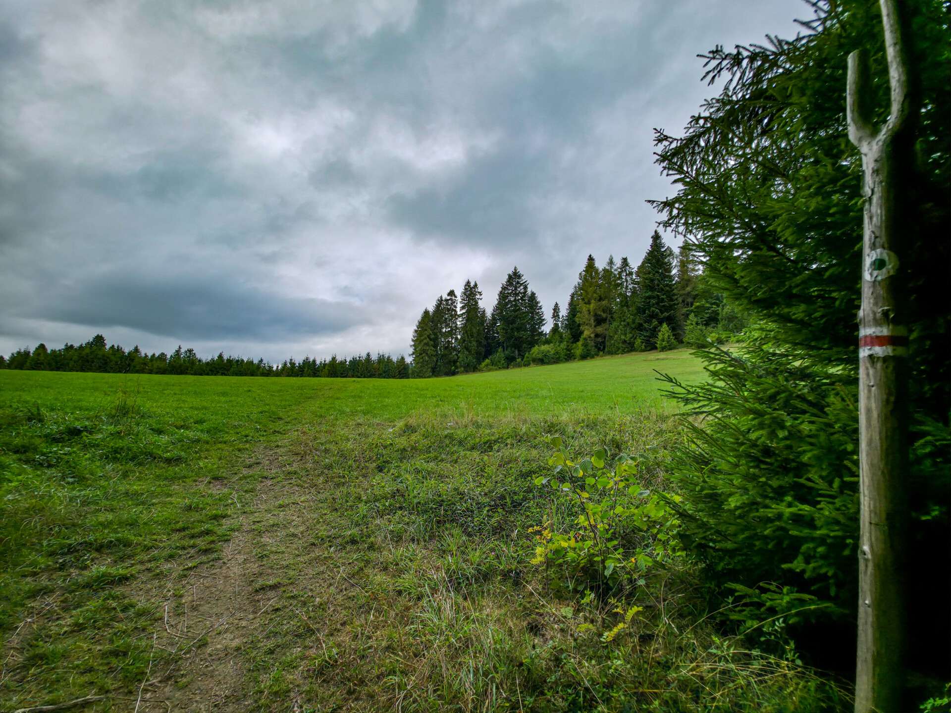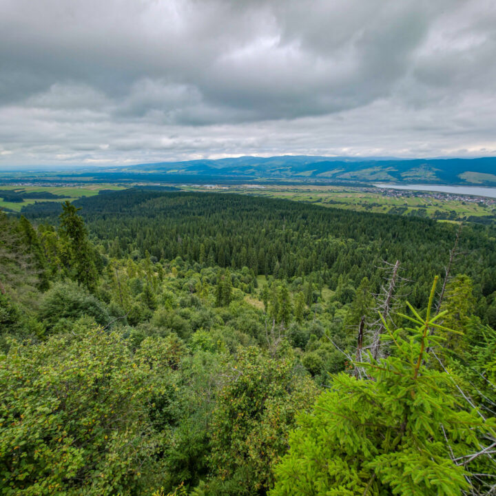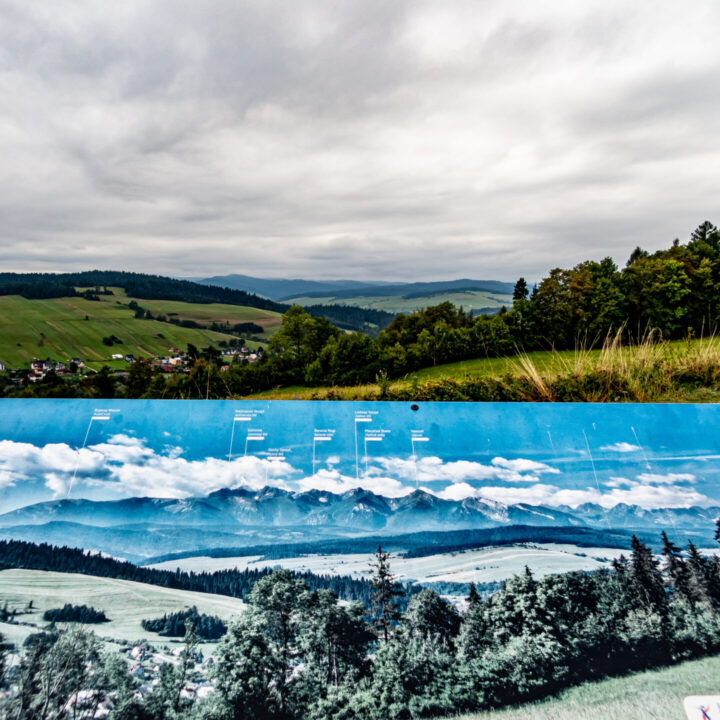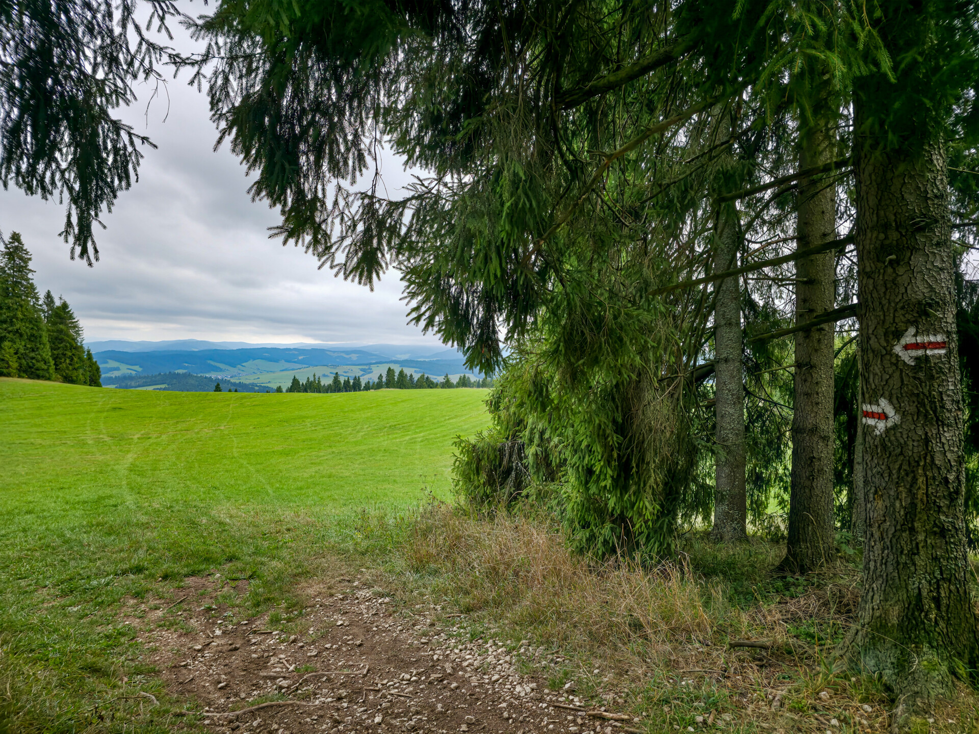Jako, że dzień wcześniej lało i chcąc nie chcąc byliśmy zmuszeni poświęcić sobotę na regenerację po 25-kilometrowym spacerku po Tatrach, to przynajmniej niedziela, choć pochmurna i szara, nie serwowała deszczu. Zawsze to jakiś pozytyw, ale niestety chmury nie dawały zbytnio nadziei na to, na co najbardziej liczyłem podczas tej wycieki – fantastyczną panoramę Tatr z Grandeusa 796 m n.p.m. To właśnie z tego miejsca możecie bardzo często podziwiać niezwykłe fotografie Tatr z charakterystycznym przedpolem składającym się z falujących łąk i pól. W zależności od pory roku zielonych, żółtych, czerwonych, białych – bardzo malownicze miejsce. Dlatego zaproponowałem, żeby na Żar dotrzeć przez Grandeus czerwonym szlakiem z Łapsze Wyżne, zamiast krócej z Dursztyna z pominięciem tego bezleśnego wzniesienia.