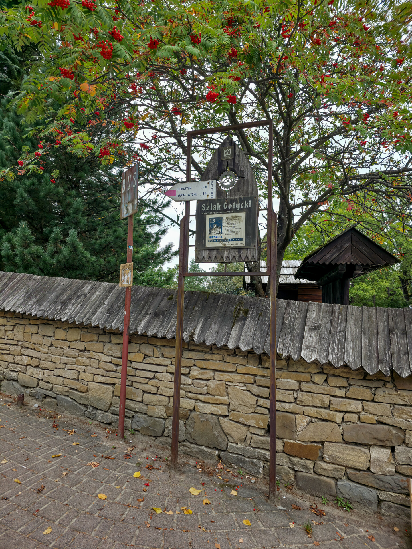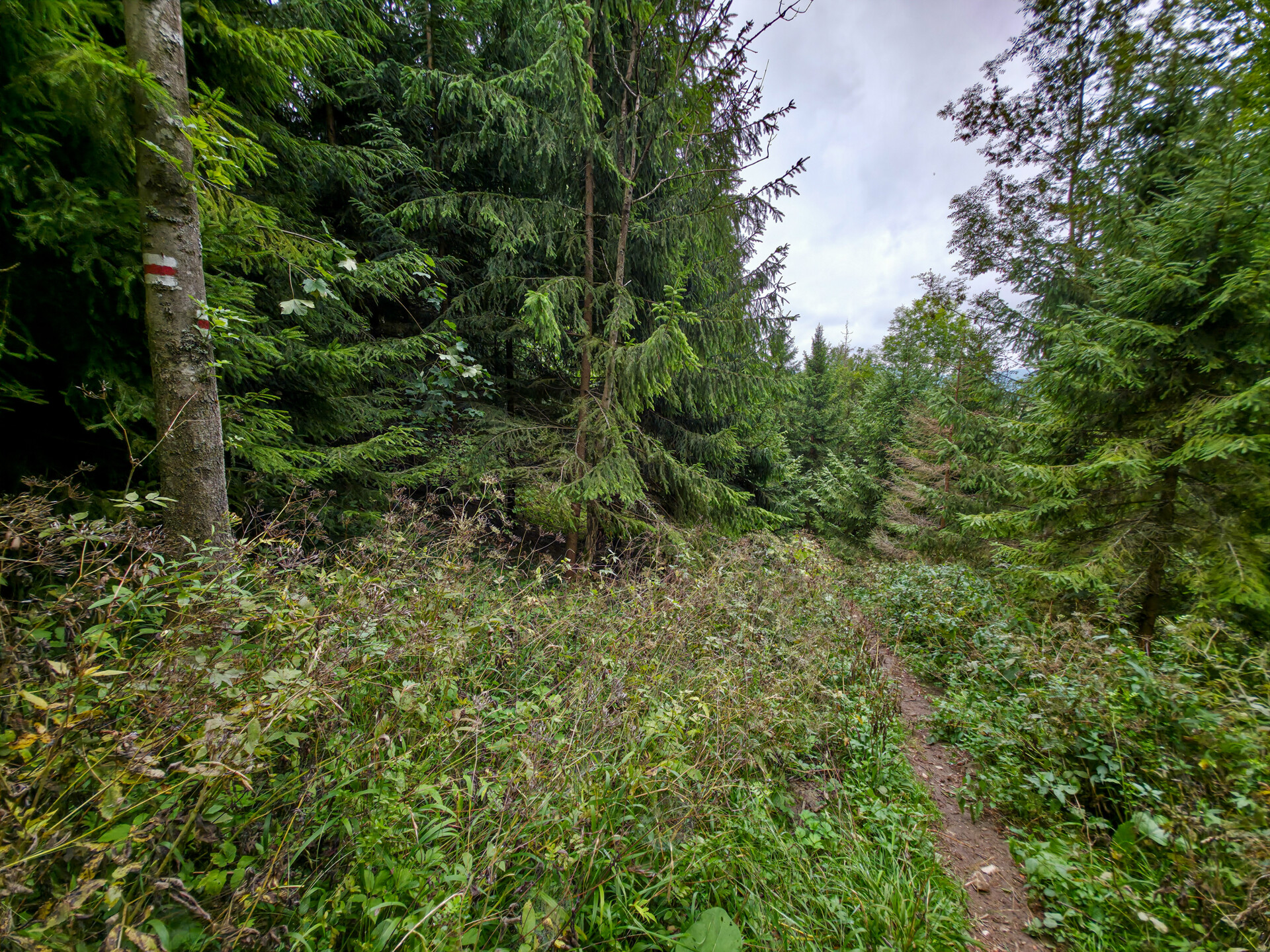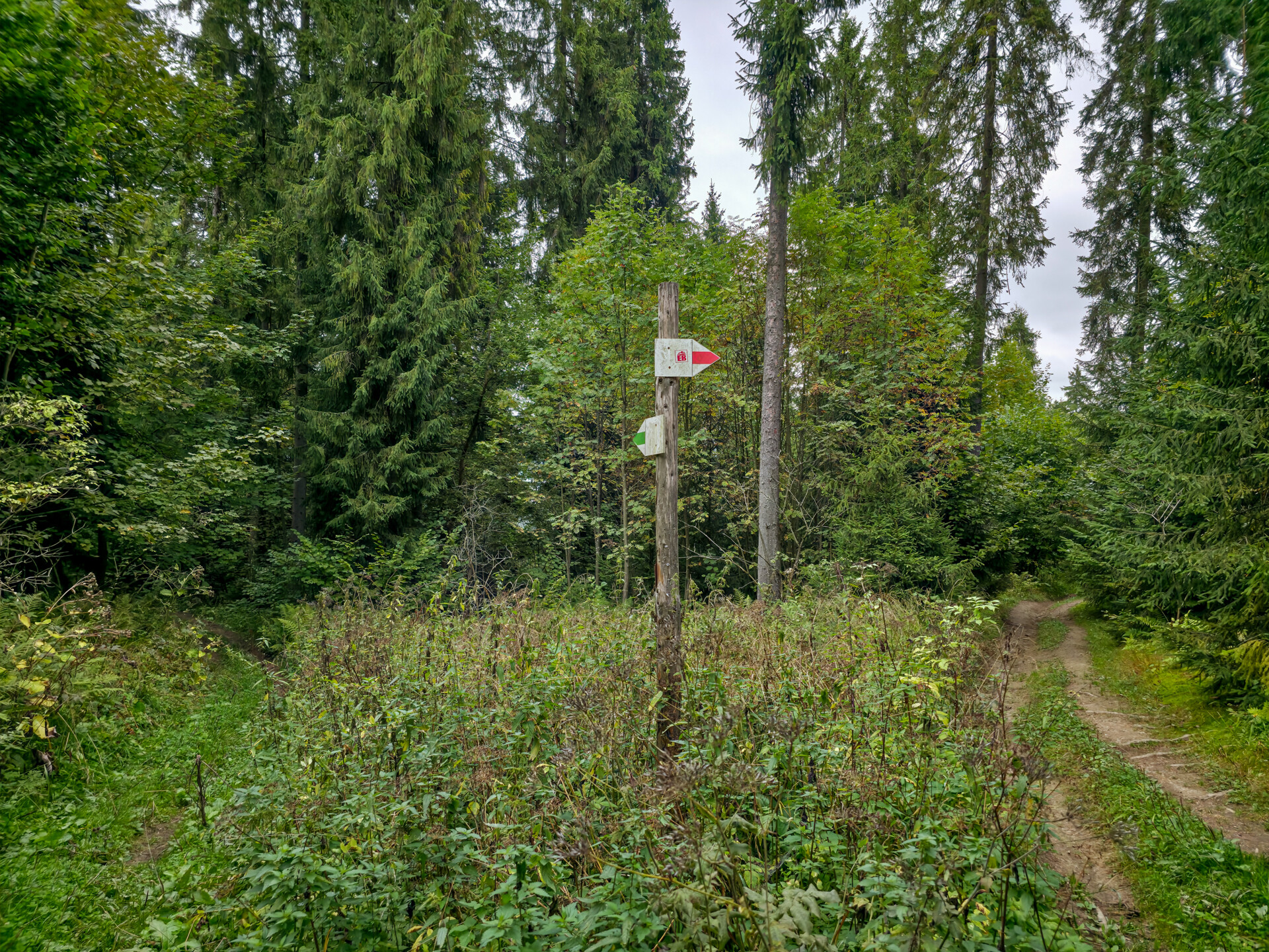 Z bezpłatnego parkingu obok Kościoła św. Apostołów Piotra i Pawła w Łapszach Wyżnych wyruszyliśmy chwilę po godzinie 11 od razu kierując swoje kroki na czerwony szlak, którym dość szybko wznieśliśmy się ponad zabudowę. Średnie nachylenie tego pierwszego odcinka wynosi trochę ponad 15%, więc od razu nastawcie się na aktywną rozgrzewkę na starcie, a jeśli jest mokro lub pada to także na szybko zabłocone buty.