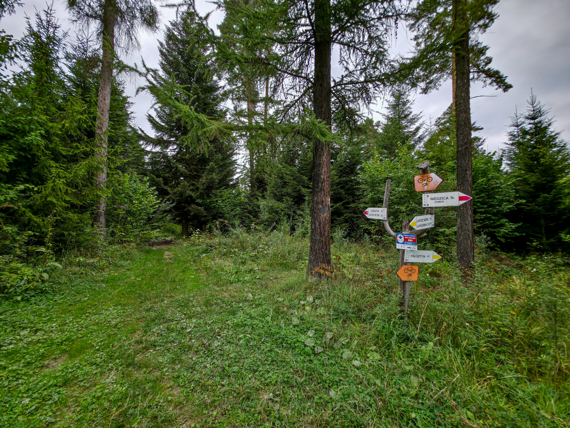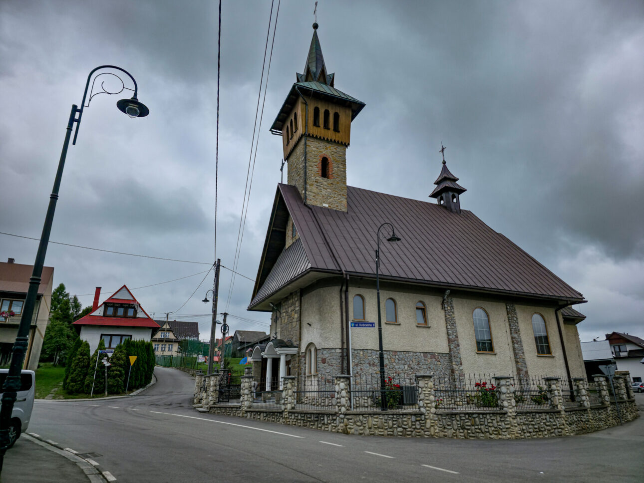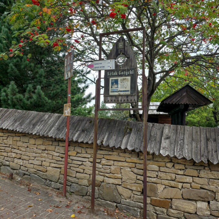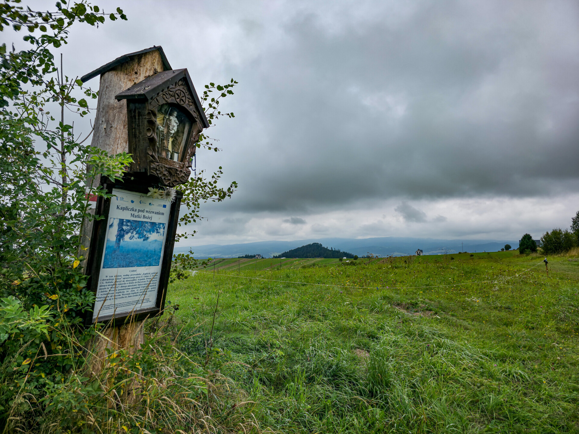 Z bezpłatnego parkingu obok Kościoła św. Apostołów Piotra i Pawła w Łapszach Wyżnych wyruszyliśmy chwilę po godzinie 11 od razu kierując swoje kroki na czerwony szlak, którym dość szybko wznieśliśmy się ponad zabudowę. Średnie nachylenie tego pierwszego odcinka wynosi trochę ponad 15%, więc od razu nastawcie się na aktywną rozgrzewkę na starcie, a jeśli jest mokro lub pada to także na szybko zabłocone buty.