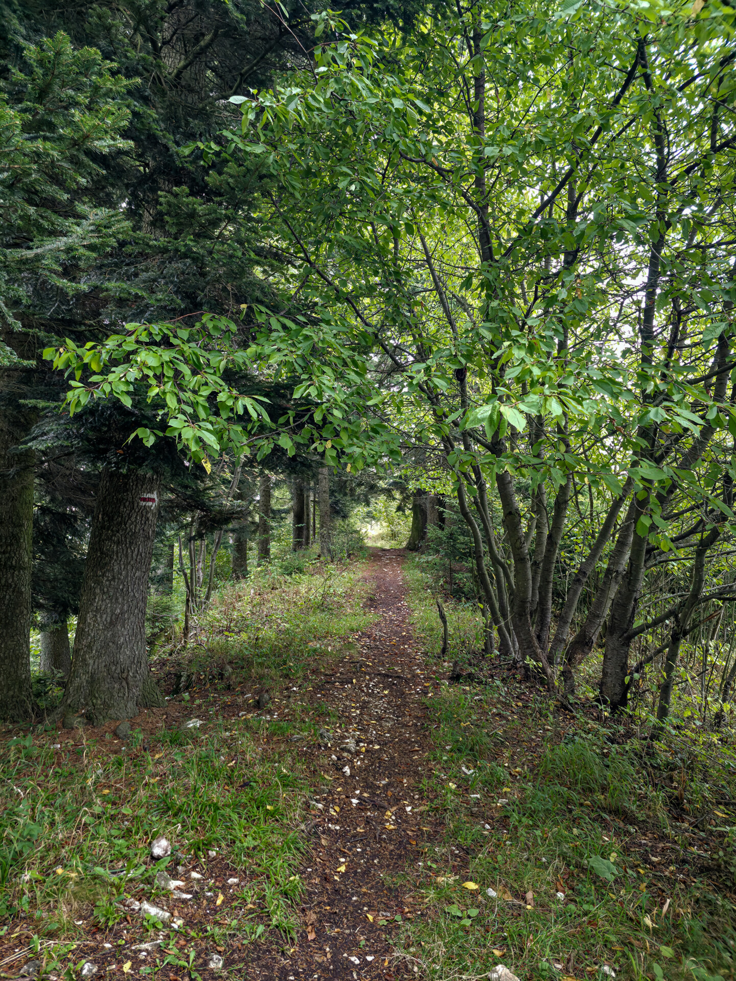 Dla wszystkich maruderów – po dotarciu na Łós (tak naprawdę w jego pobliże oznaczone amatorsko na drzewie przy szlaku, bo sam szczyt jest w przeciwnym kierunku niż czerwony szlak) nic wymagającego wysiłku wspinaczkowego Was już nie czeka*. Od tego momentu czerwony szlak wiedzie grzbietem Pienin Spiskich, najpierw płasko, a po osiągnięciu szczytu Żar opada łagodnie w kierunku Niedzicy. Grzbiet ten jest dość wąski, choć oczywiście nie na tyle, żeby porównać go do tatrzańskich grani. Nie mniej jednak momentami można zarówno oglądać panoramę rozciągającą się na północ (Gorce) jak i południe (Tatry). W dzień pochmurny wymagana jest jednak duża wyobraźnia, żeby te panoramy zobaczyć.