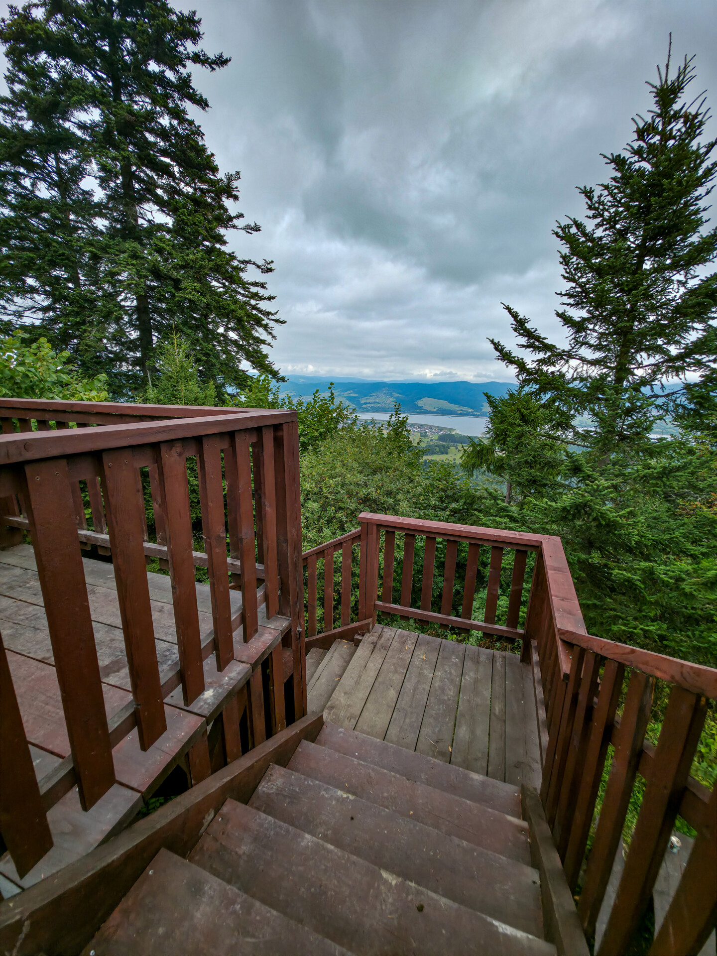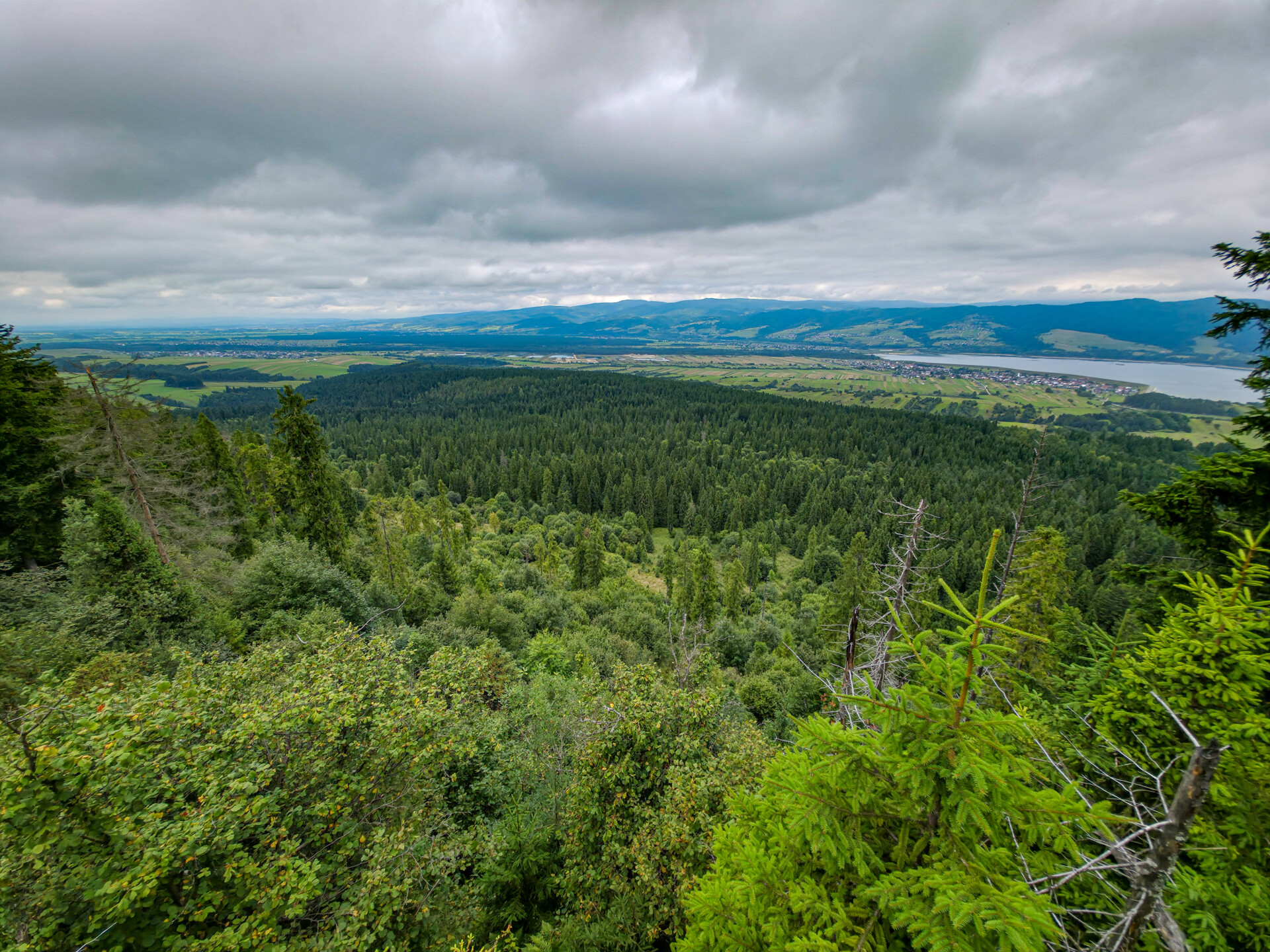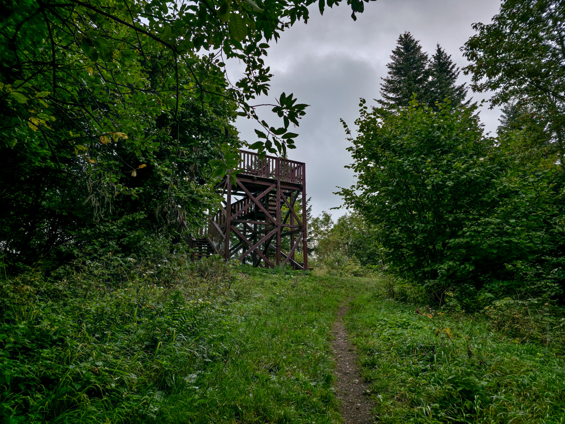 Na pokonanie odcinka od Łós do „wieży widokowej” na górze Żar potrzebowaliśmy nieco ponad 10 minut. Specjalnie użyłem apostrofów, ponieważ nazwanie tej drewnianej konstrukcji wieżą widokową to lekka przesada. Platforma bez zadaszenia i nie koniecznie widokowa o wysokości (na moje oko) ok. 5 metrów niestety nie oferuje specjalnych widoków. Nie różnią się one od tego, co chwilę wcześniej oferował głaz obok Dziury Mutiego, przy czym wierzchołki drzew poniżej za kilka lat zasłonią całkowicie ten widok. O widoku na Tatry zapomnijcie. Drzewa skutecznie to uniemożliwiają.