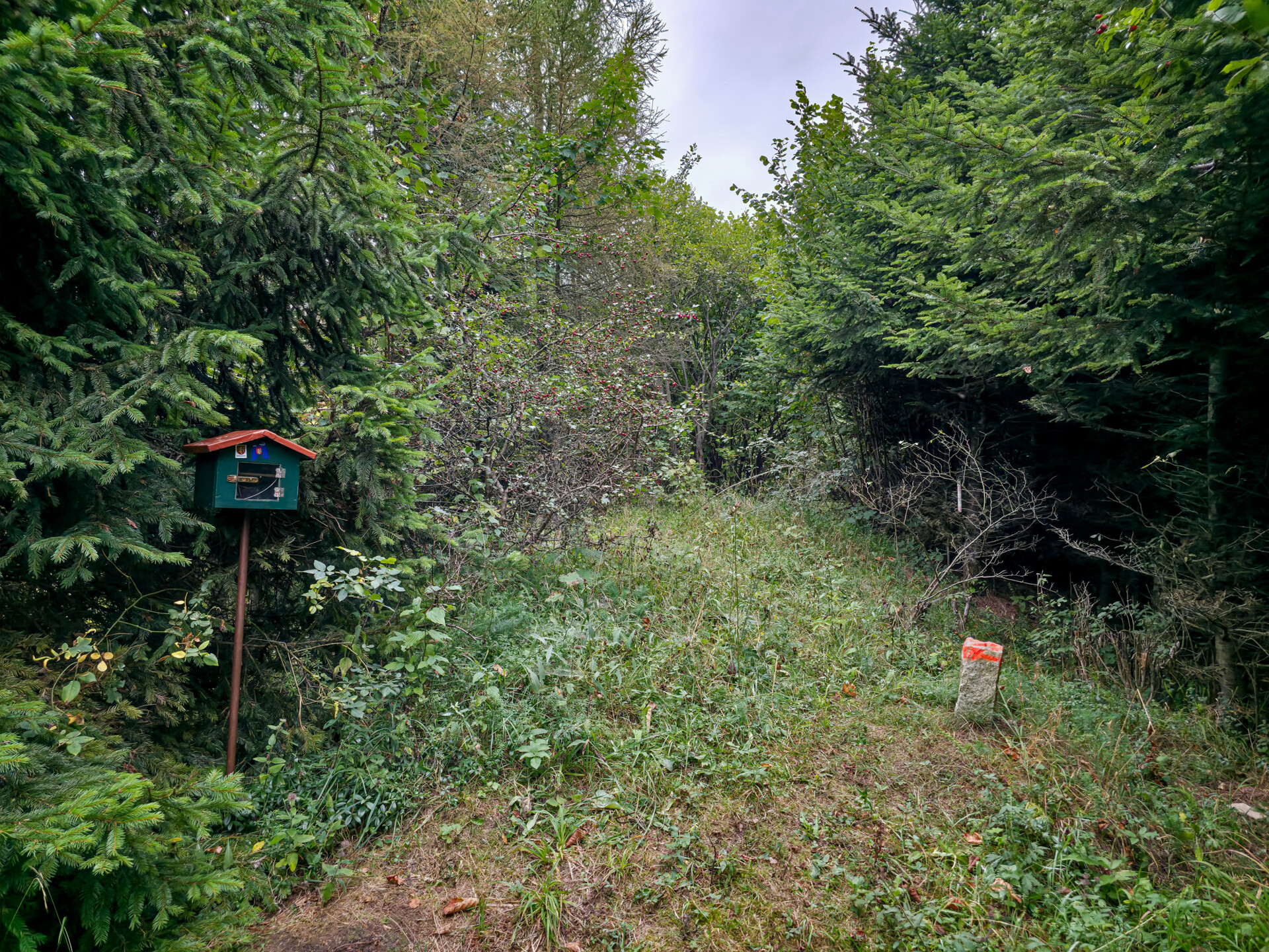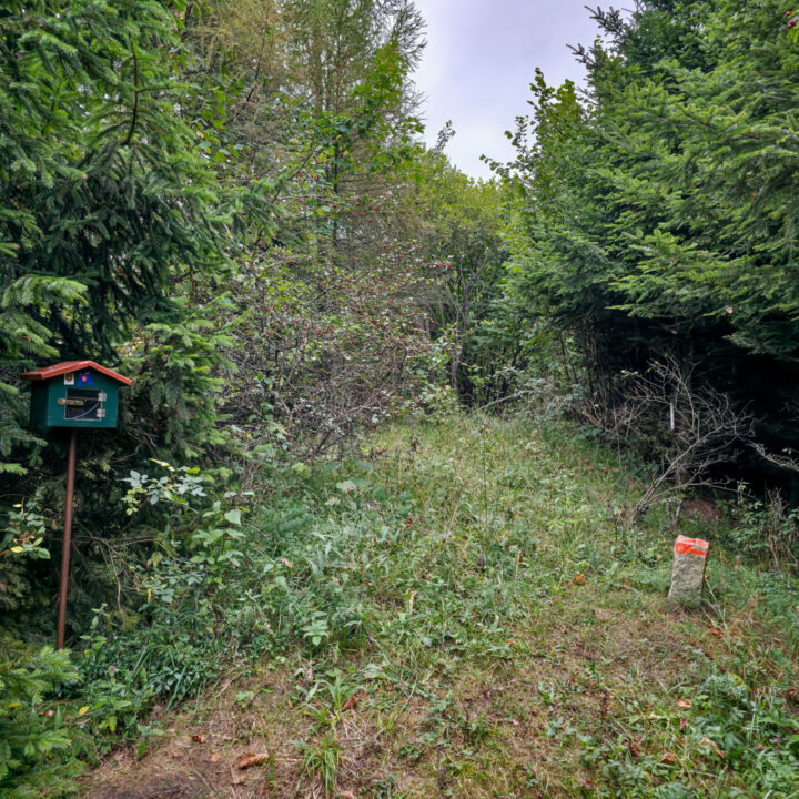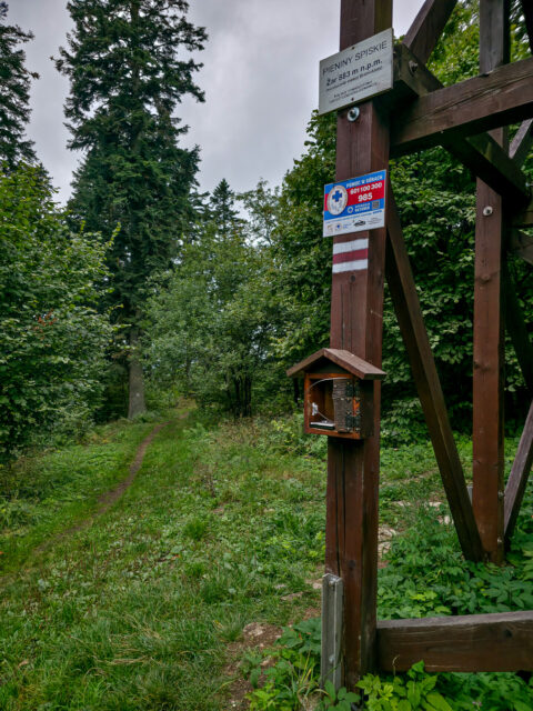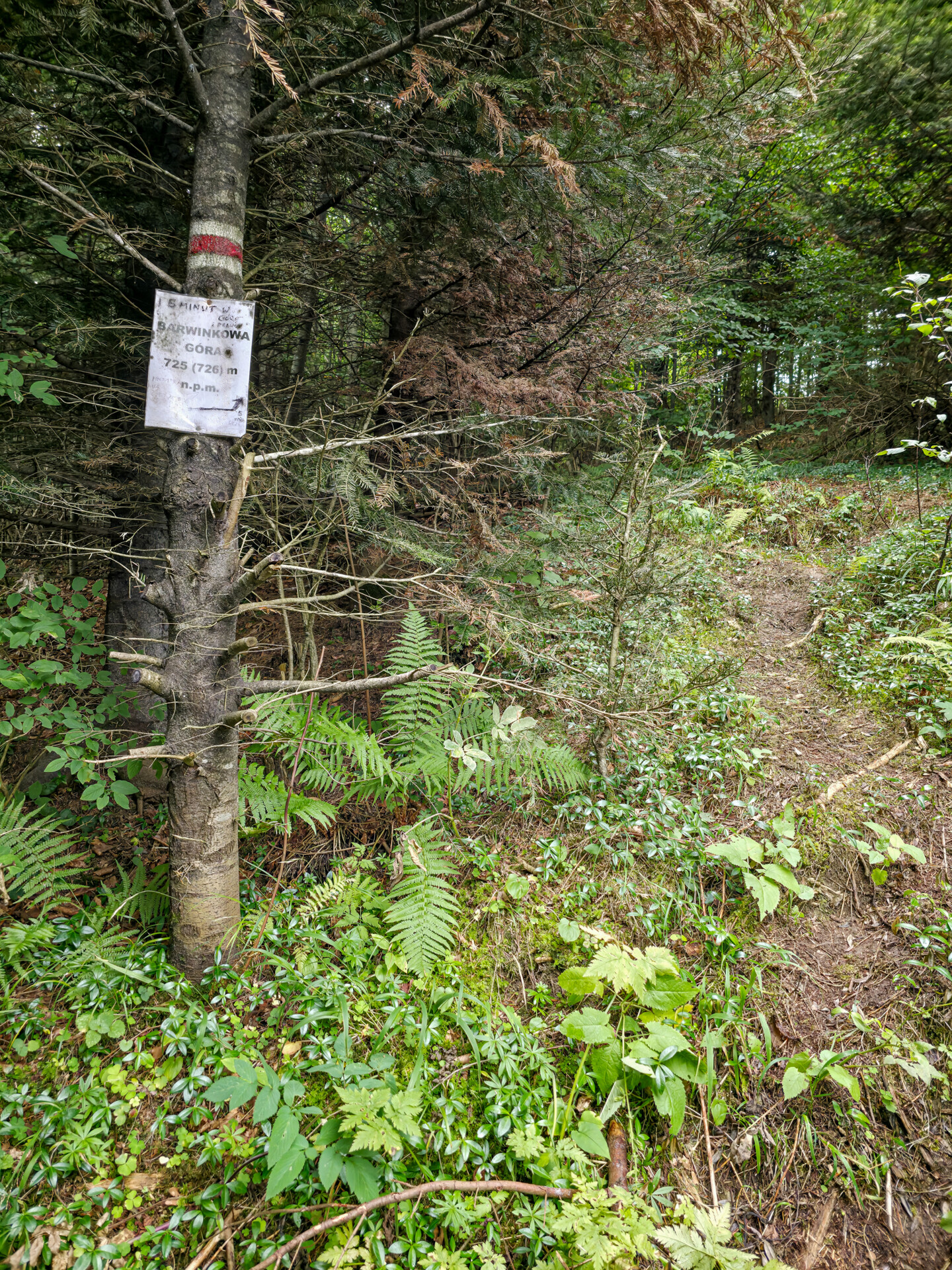 * Wspomniałem wcześniej, że po ataku na Łós „nic wymagającego wysiłku wspinaczkowego Was już nie czeka”, ale… Kilkaset metrów za przełęczą dostrzeżecie na jednym z drzew odręcznie przygotowaną tabliczkę z informacją o możliwości dotarcia na Barwinkową Górę 727 m n.p.m. z zachęcającą informacją o „pieczątce na szczycie”. Jeśli nie straszne Wam dodatkowe 5 minut i ok. 20-30 metrów wspinaczki to możecie zdobyć ten szczyt i pieczątkę, którą faktycznie znajdziecie w skrzyneczce na górze. Choć Coco nie bardzo uśmiechało się przedzieranie się przez las i wdrapywanie na kolejny szczyt, to wabik w postaci dodatkowej pieczątki zadziałał. Barwinkowa Góra zdobyta w kilka chwil. Sam szczyt nie oferuje żadnych widoków, ani nawet tabliczki szczytowej, ale pieczątka wynagradza „trud” dotarcia na górę 🙂