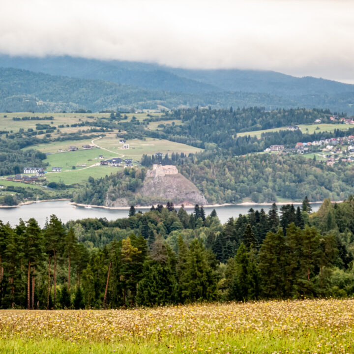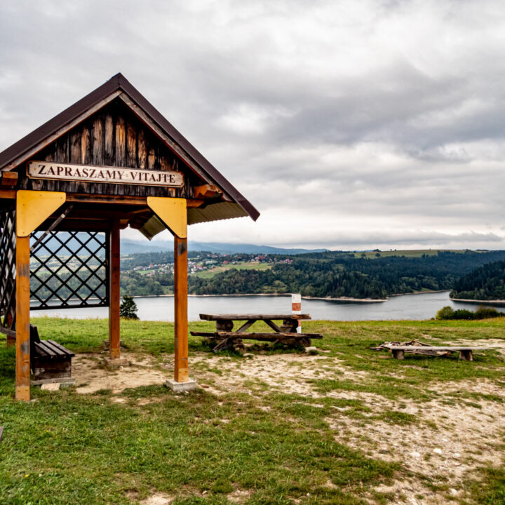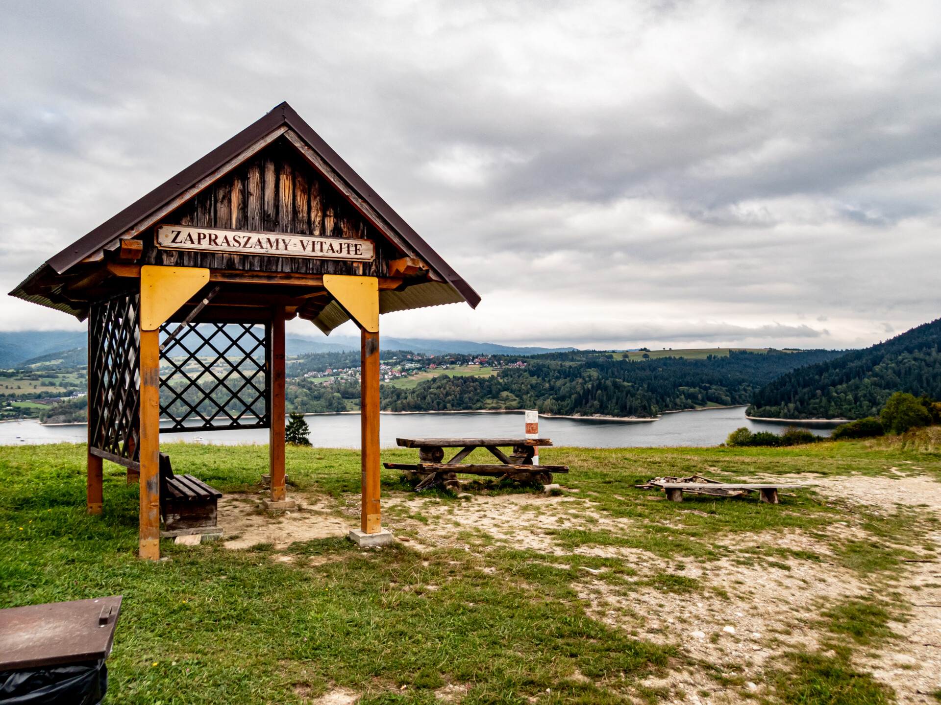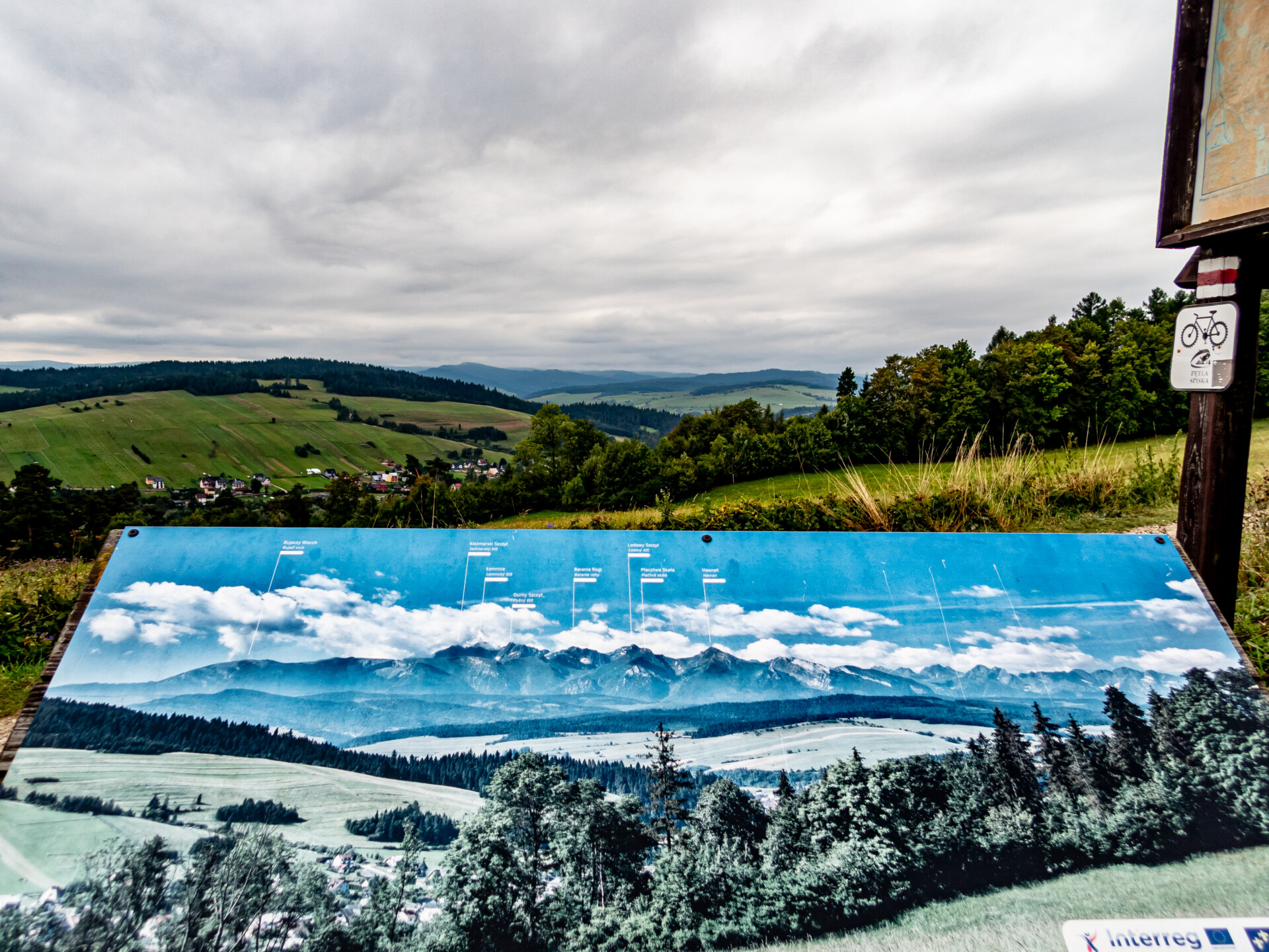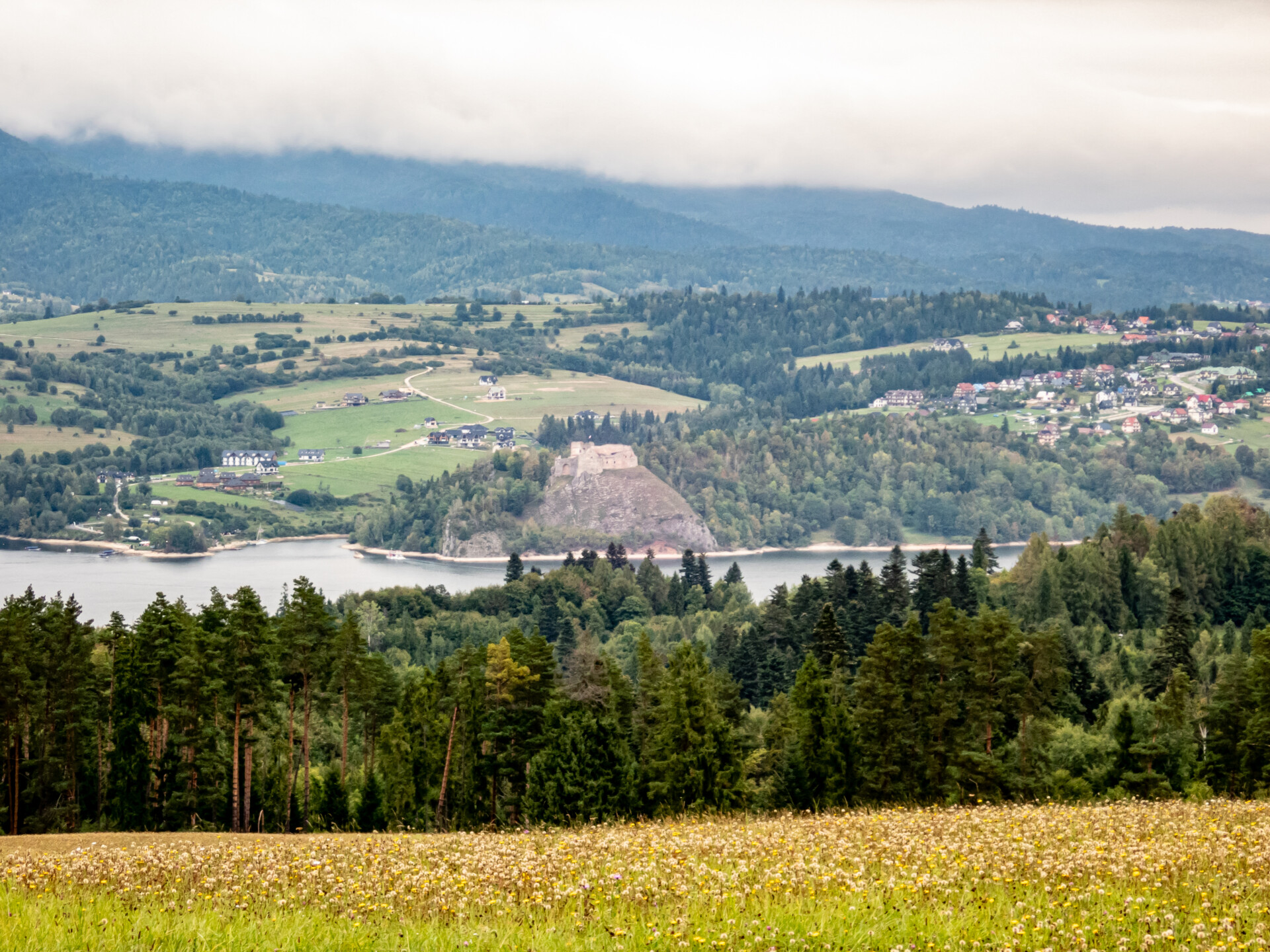 Po około 5 kilometrach od szczytu Żar docieramy na dużą Halę Cisówka, skąd przepięknie otwiera się widok na Jezioro Czorsztyńskie i górujące nad nim Gorce. Dalej Beskid Sądecki, który tego dnia spowijały chmury. Na szczęście Pieniny i Trzy Korony nie zawiodły i pomimo pochmurnego nieba malowały się na horyzoncie pejzażowo. Po dotarciu do wiaty turystycznej pod masztem telekomunikacyjnym Nad Tabor 618 m n.p.m. mieliśmy po raz kolejny cieszyć się panoramą Tatr, ale musieliśmy obejść się smakiem i obejrzeć wyłącznie ich wydrukowaną i opisaną wersją na tablicy wersję. Ulicą Profesorską dotarliśmy Niedzicy tuż obok Zamku Dunajec.